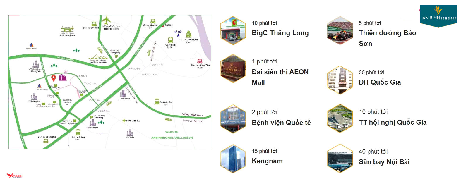 An Bình HomeLand nằm gần các khu đô thị lớn và tổ hợp văn phòng thương mại hiện đại. Dự án được kế thừa cơ sở hạ tầng đồng bộ của khu đô thị Geleximco, khu đô thị Dương Nội và các dự án lân cận, khu vui chơi Thiên đường Bảo Sơn, đặc biệt AEON Hà Đông đã được khai trương cuối 2019… Cực kỳ thuận tiện cho nhu cầu sinh hoạt, vui chơi, giải trí, mua sắm của cư dân.