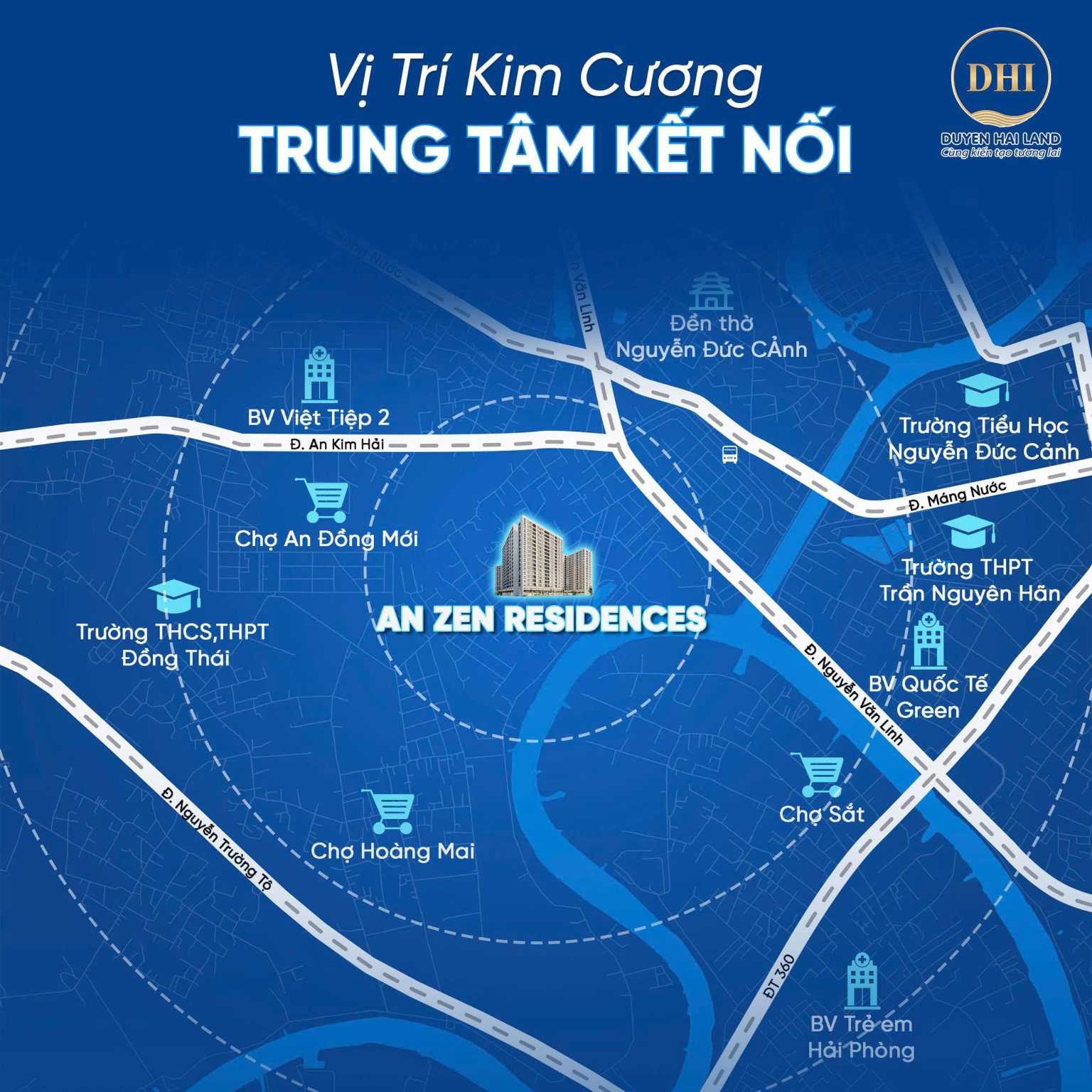 Đặc biệt, Dự án An Zen Hải Phòng còn nằm gần các trục giao thông huyết mạch như: Quốc lộ 5A, Quốc lộ 10, đường 351, đường 208, cao tốc Hà Nội – Hải Phòng,… Giúp kết nối nhanh chóng về thành phố Hà Nội và các tỉnh lân cận khu vực phía Bắc.