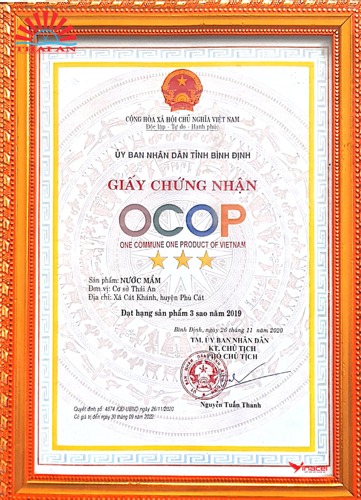 Năm 2019, cơ sở nước mắm Thái An mạnh dạn mang sản phẩm tham dự Chương trình OCOP, là chương trình phát triển kinh tế khu vực nông thôn theo hướng phát triển nội lực và gia tăng giá trị; là giải pháp, nhiệm vụ trong triển khai thực hiện chương trình mục tiêu quốc gia xây dựng nông thôn mới. Trọng tâm của chương trình OCOP là phát triển sản phẩm nông nghiệp, phi nông nghiệp, dịch vụ có lợi thế ở mỗi địa phương theo chuỗi giá trị, do các thành phần kinh tế tư nhân (doanh nghiệp, hộ sản xuất) và kinh tế tập thể thực hiện và đạt chứng nhận 3 sao.
