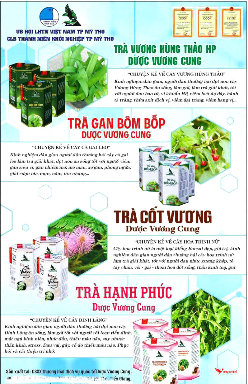 Sau khi nghiên cứu sản xuất một số trà giải khát từ thảo dược được thị trường chấp nhận, như: Trà Vương Hùng Thảo HP, trà gan Bôm Bốp, trà Cốt Vương… Trong năm 2023, anh Lê Vương Quốc Hùng, chủ Cơ sở sản xuất Thương mại Dịch vụ quốc tế Dược Vương Cung (xã Tân Mỹ Chánh, TP. Mỹ Tho, tỉnh Tiền Giang) tiếp tục nghiên cứu cho ra đời sản phẩm trà “Hạnh phúc”.