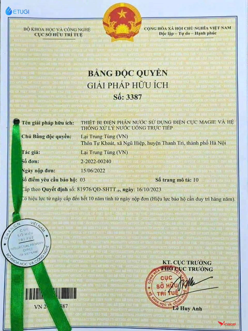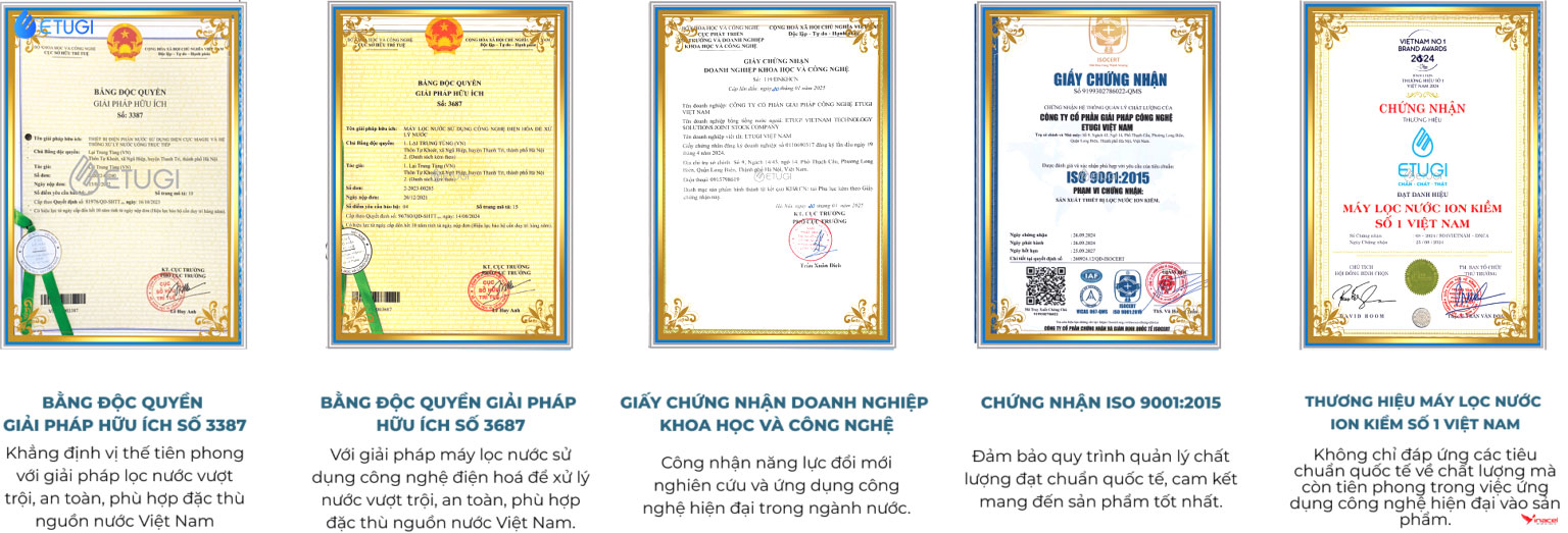 • Là doanh nghiệp khoa học công nghệ của Việt Nam, Etugi hiện là thương hiệu tiên phong trong các sáng chế kỹ thuật dành cho máy tạo nước kiếm. Chỉ trong vòng 2 năm, Etugi đã nhận được các chứng nhận, giải thương uy tin từ các tổ chức trong và ngoài nước. Đặc biệt, đội ngũ kỹ sư của Etugi đã cùng đội ngũ y bác sỹ uy tín có những nghiên cứu khoa học đã được công nhận bởi hội đồng y khoa Việt Nam, được đăng trên các tạp chí Y học hàng đầu của Việt Nam về nước kiềm đối với sức khỏe người sử dụng được tạo ra từ sản phẩm máy tạo ion kiềm Etugi.