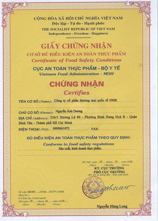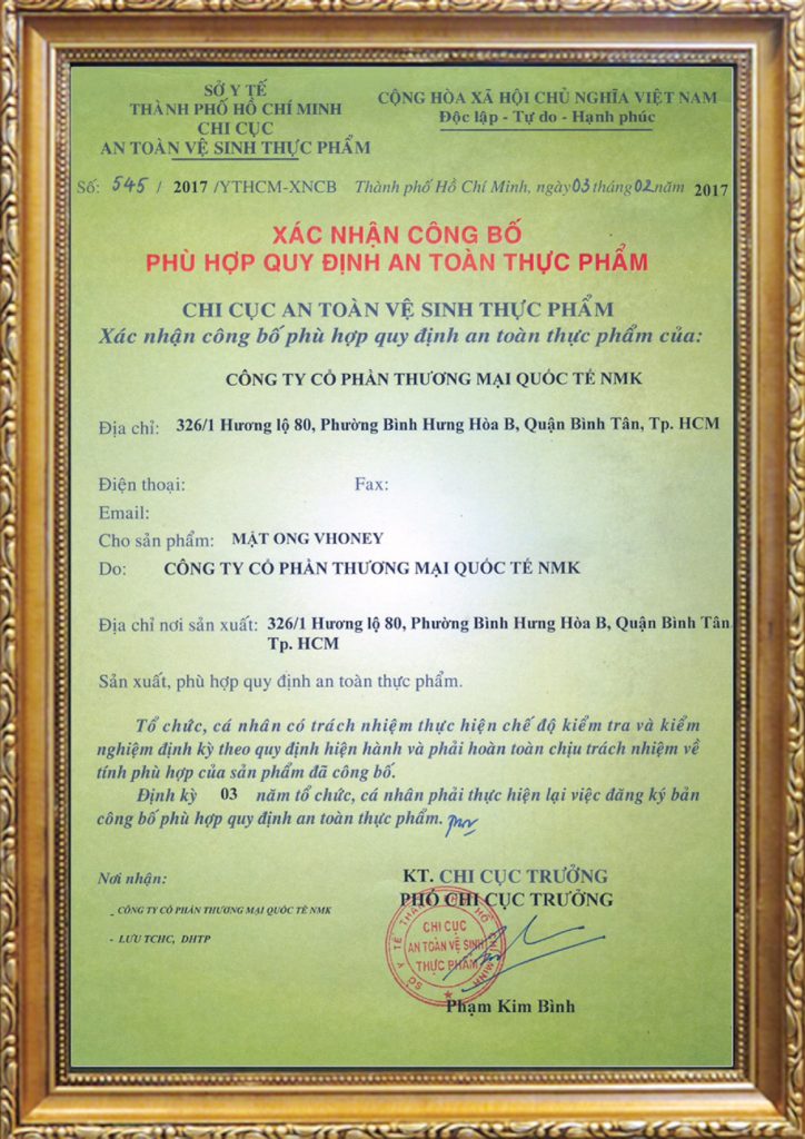 Công Ty Cổ Phần Thương Mại Quốc Tế NMK chuyên sản xuất, kinh doanh thực phẩm, tất cả sản phẩm của công ty đều cam kết ” không pha trộn, không phụ da, không chất bảo quản. Vhoney tuân thủ quy trình kiểm soát khép kín đảm bảo Vệ Sinh An Toàn Thực Phẩm của Bộ Y Tế.