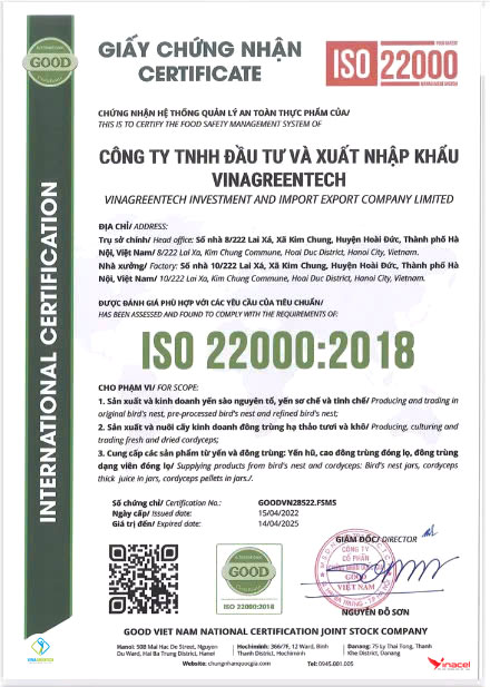 Công ty TNHH đầu tư và xuất nhập khẩu Vinagreentech, TP. Hà Nội là Công ty chuyên cung cấp các sản phẩm Yến Sào – Đông Trùng Hạ Thảo. Yến Sào Vinagreennest được thu hái từ nhà nuôi Yến thiên nhiên tại Diên Thọ – Diên Khánh – Khánh Hòa – Ninh An – Ninh Hòa – Khánh Hòa. Sản phẩm Đông Trùng Hạ Thảo Vinagreentech được chuyển giao công nghệ từ viện công nghệp sinh học Lâm Nghiệp.