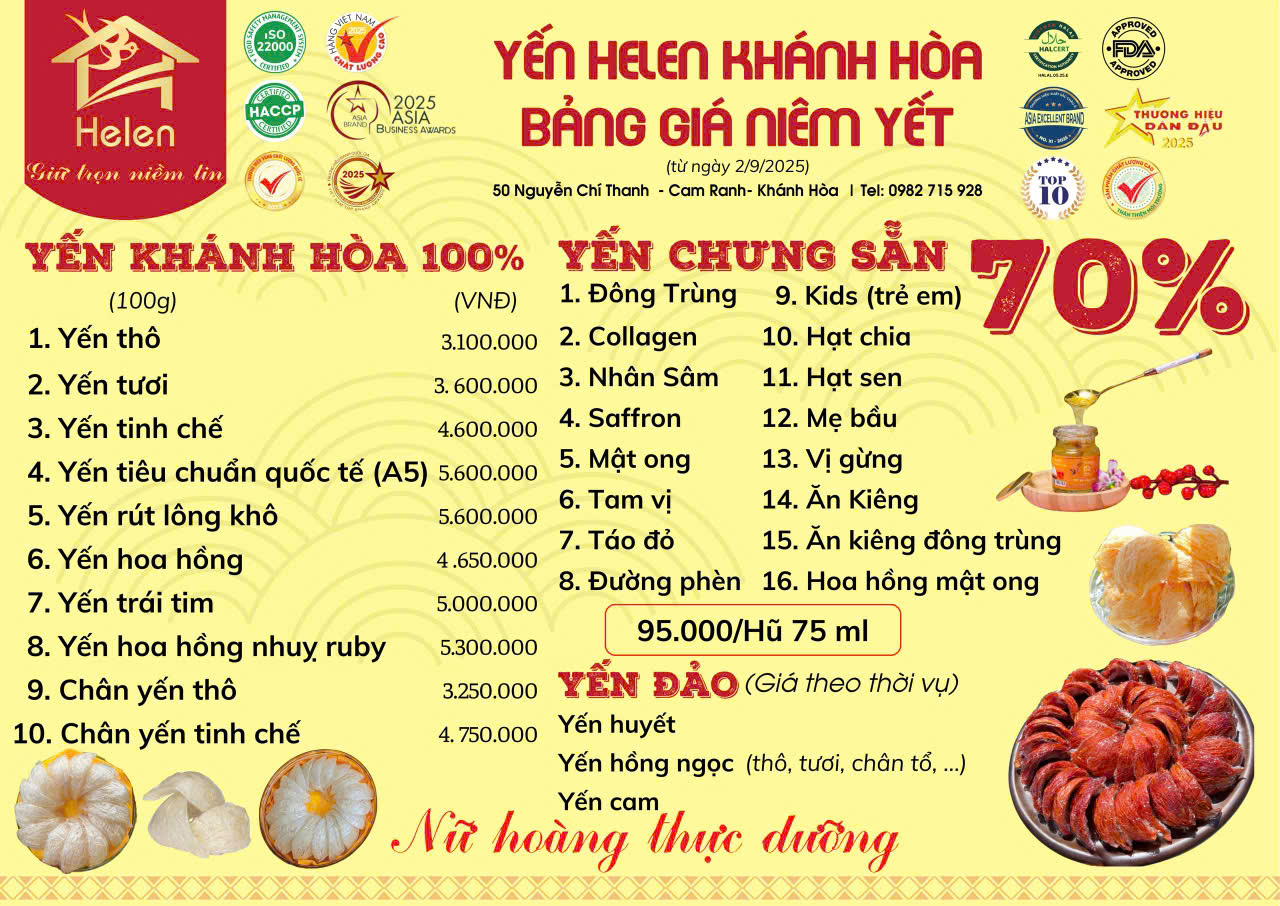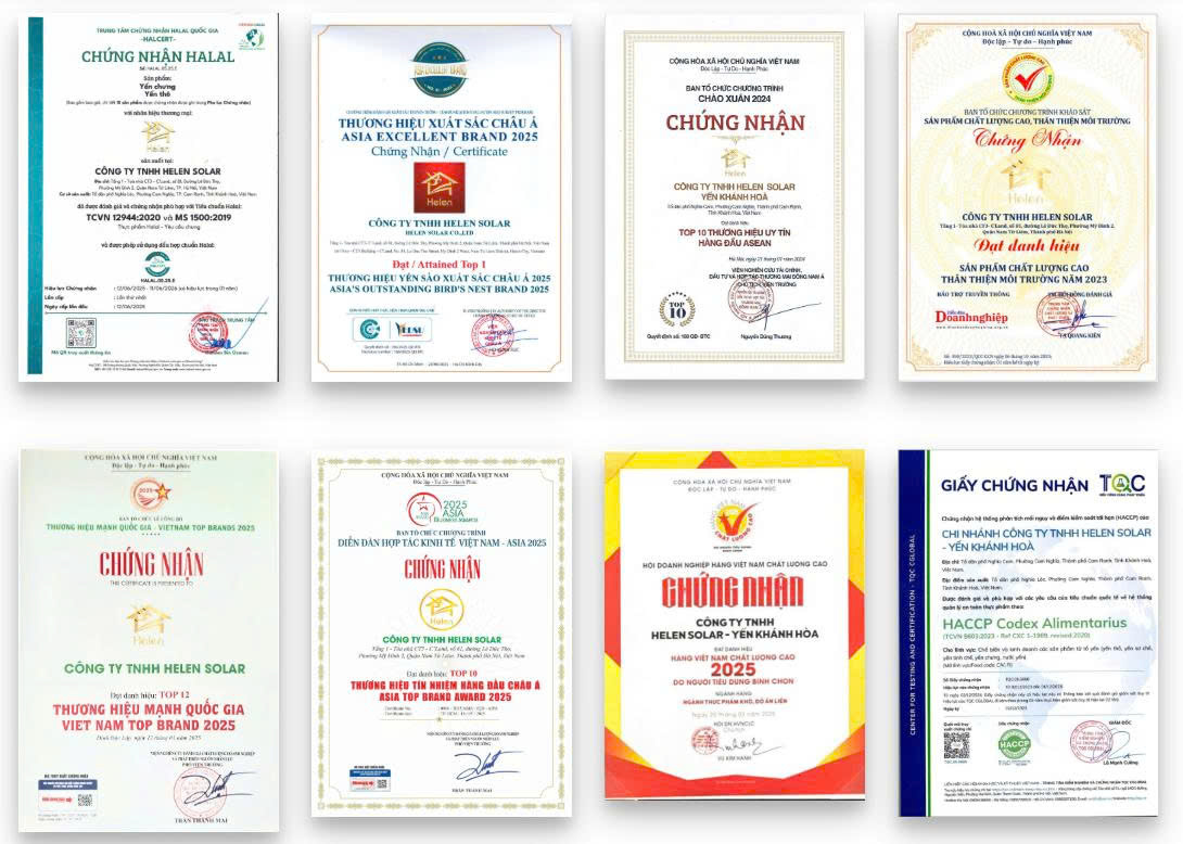 Tháng 6/2025, Yến Helen Khánh Hòa đã nhận được chứng nhận Halal (đối với sản phẩm yến chưng) và yến thô.