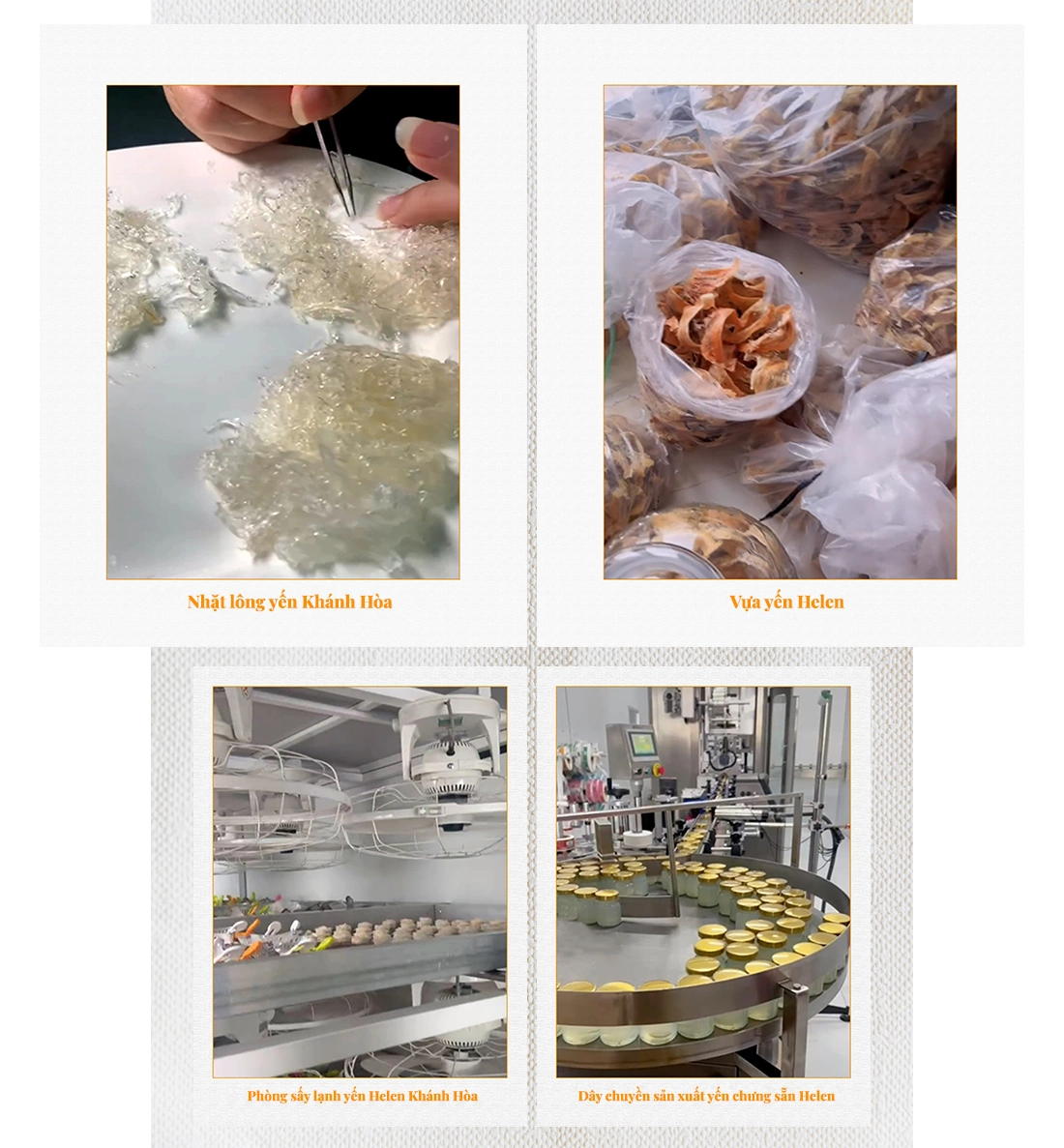 Nhà máy sản xuất yến Helen cùng với HTX Yến Cam Ranh Khánh Hòa thuộc tổ hợp Yến Helen Group chuyên sản xuất yến (yến hũ) với công thức chưng truyền thống kết hợp với dây chuyền sản xuất công nghệ thanh trùng, chế biến chất lượng đạt tiêu chuẩn quốc tế về quản lý chất lượng và vệ sinh an toàn thực phẩm ISO 22000:2018, HACCP CODEX 2020.
