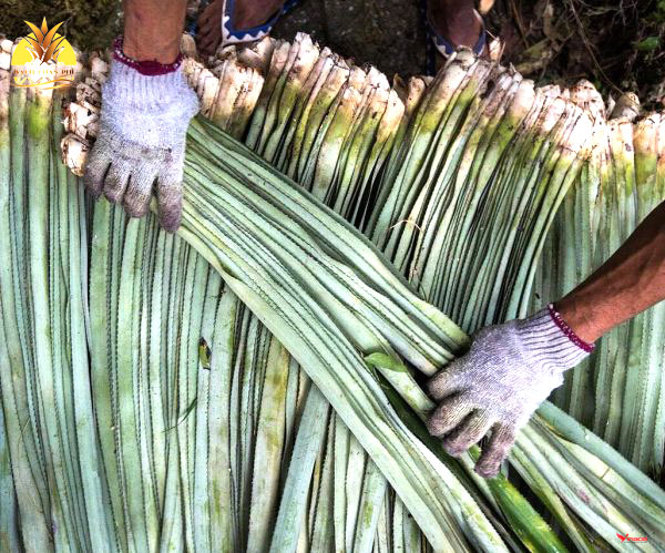 . Cắt và gọt vỏ: Cây dứa được nhổ khỏi mặt đất;lá và vỏ được tách thành từng bó theo chiều dọc trước khi được tách thủ công để lấy phần còn lại sau khi thu hoạch quả.