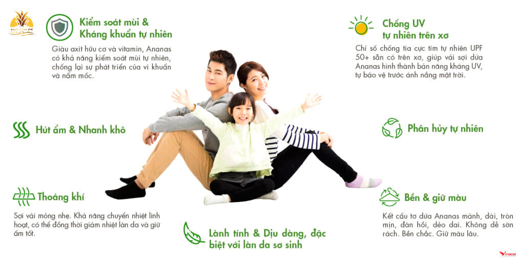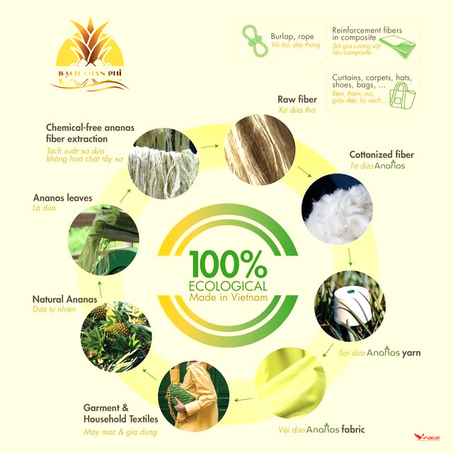 Điểm được đánh giá cao nhất về sản xuất sợi dứa là nó không cần sử dụng bất kỳ oxit kim loại nặng và các hóa chất độc hại cho sản xuất, con người và môi trường. Ngoài ra, không cần sử dụng các sản phẩm phụ có nguồn gốc động vật và đồng thời là một cách tận dụng chất thải, làm tăng thêm sức mạnh bền vững của sản xuất sợi dứa. Do đó, loại vải này có được độ bền cao, giữ được độ ẩm, thoáng khí, linh hoạt, đa năng và dễ nhuộm và in.