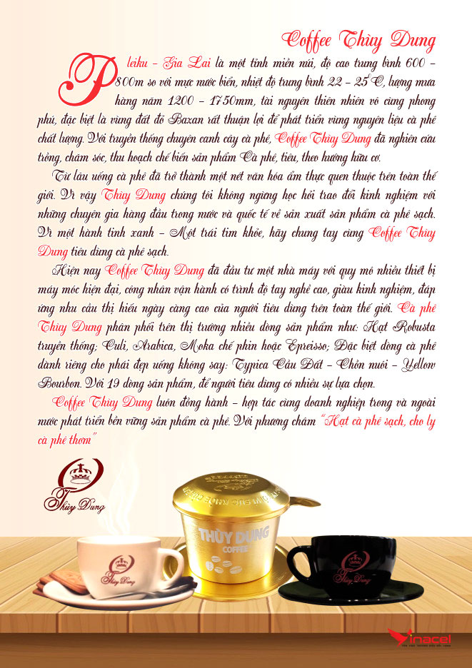 Thương hiệu cà phê Thùy Dung tuy mới tham gia vào thị trường cà phê nhưng thương hiệu cà phê Thùy Dung đã khẳng định được vị thế của mình trong top thương hiệu cà phê GIa Lai uy tín đem đến những sản phẩm chất lượng, an toàn cho sức khỏe với nguồn gốc xuất xứ rõ ràng không lo hàng giả hàng nhái hàng kém chất lượng.