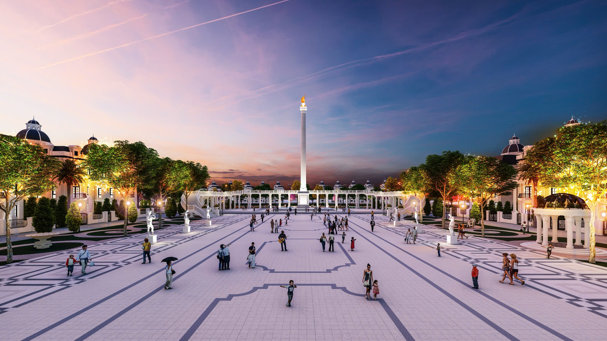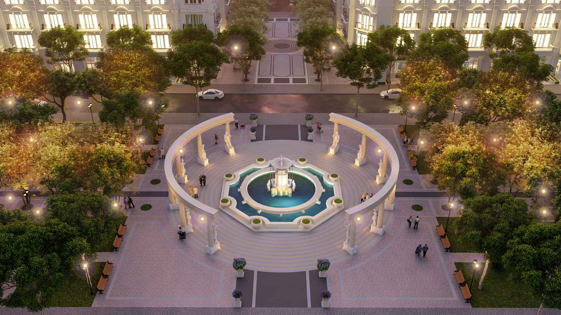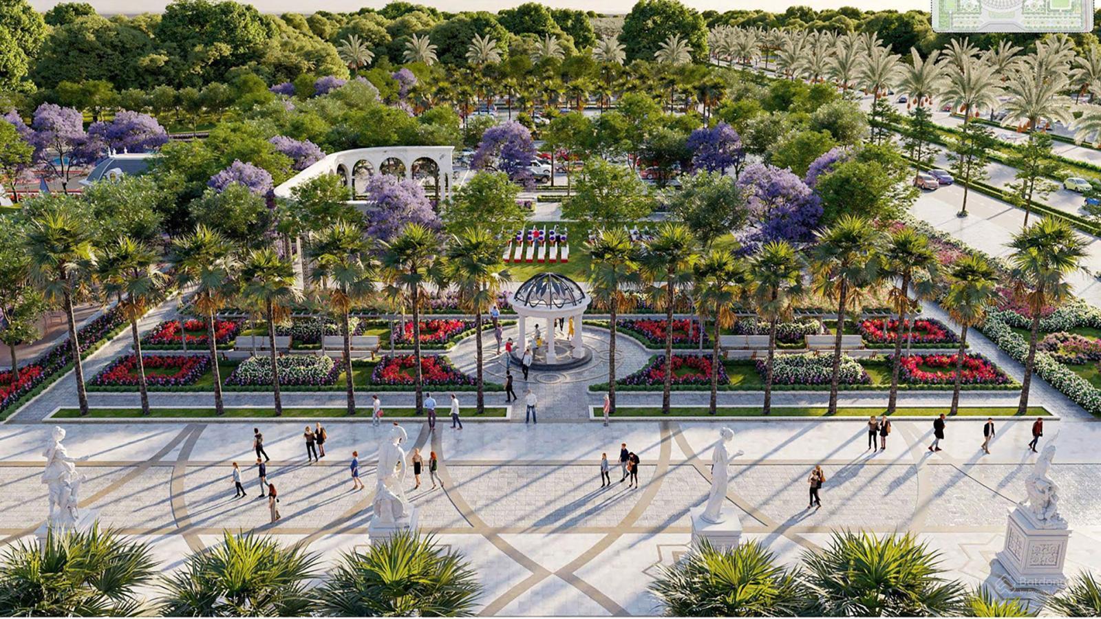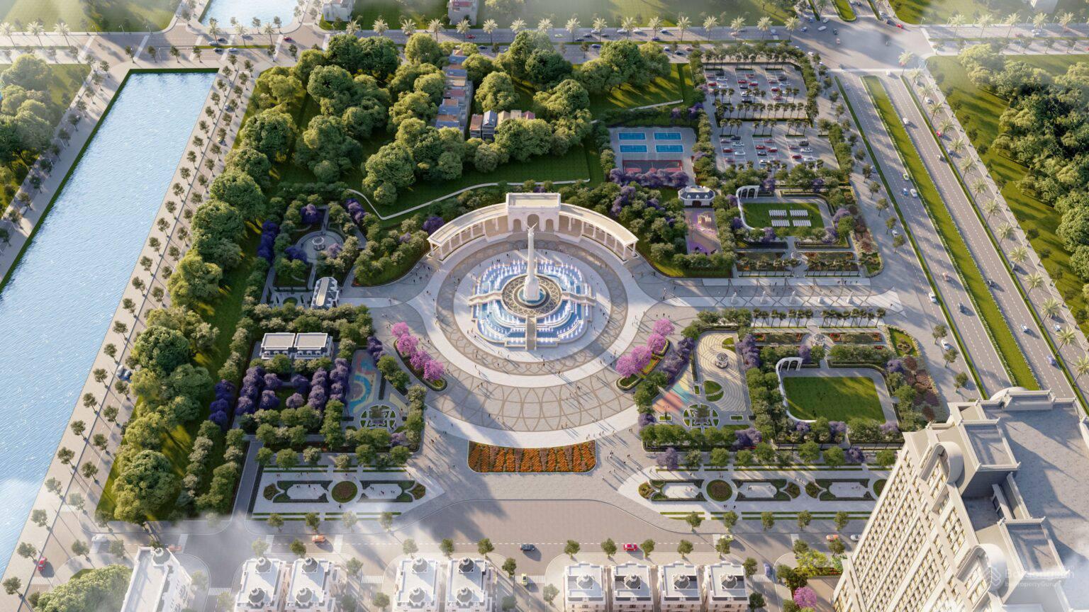 Quảng trường trung tâm “Royal Square” rộng hàng ngàn m² – nơi tổ chức sự kiện, lễ hội, hoạt động cộng đồng.