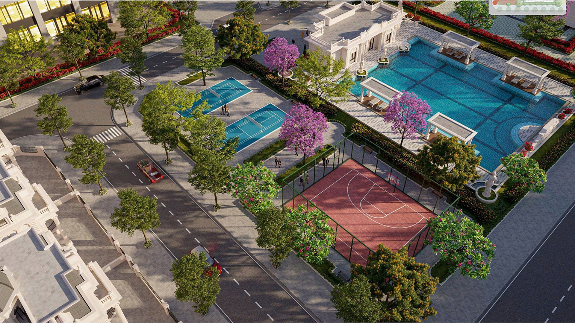 Khu thể thao, sân tennis, bể bơi, clubhouse, khu BBQ ngoài trời.