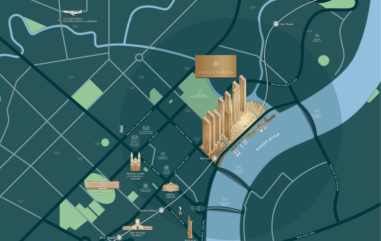 Tọa lạc tại giao lộ vàng Tôn Đức Thắng – Nguyễn Hữu Cảnh, ngay trung tâm Quận 1, Grand Marina Saigon sở hữu vị trí không thể thay thế – nơi hội tụ tinh hoa của trung tâm tài chính, văn hóa và hành chính của TP.HCM.