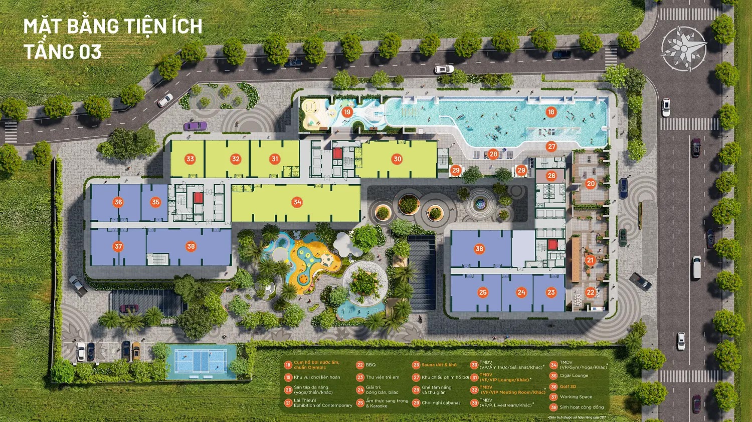• 60% diện tích là cây xanh, mặt nước & tiện ích – tạo môi trường sống gần gũi thiên nhiên.