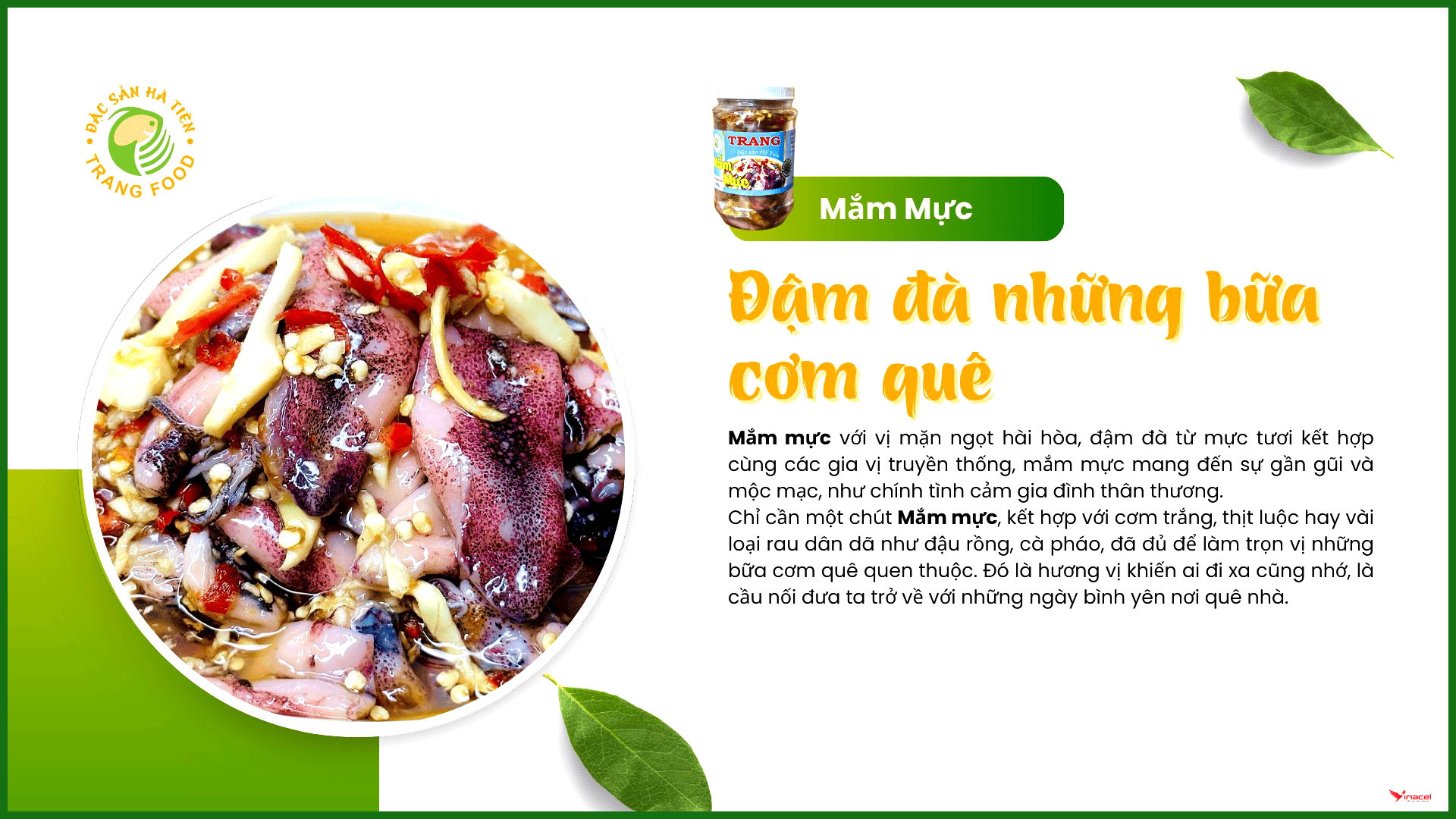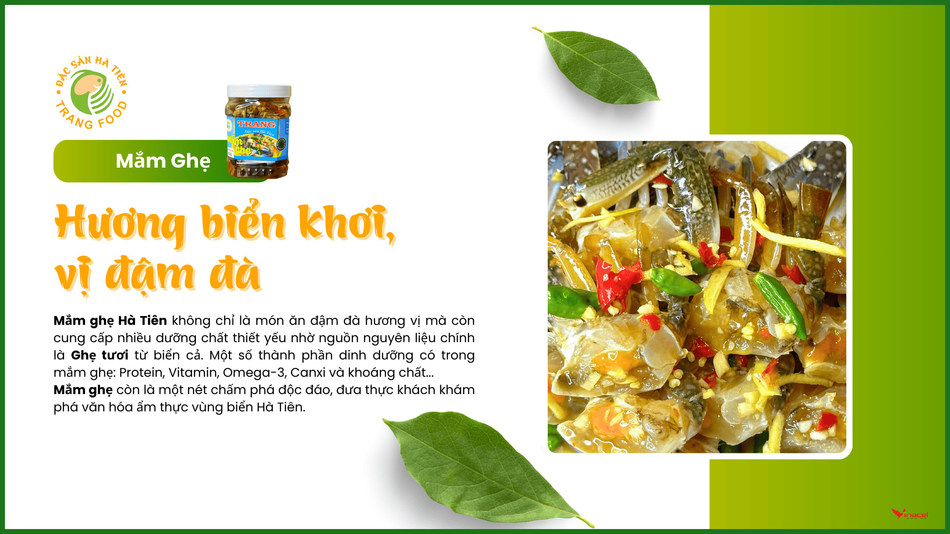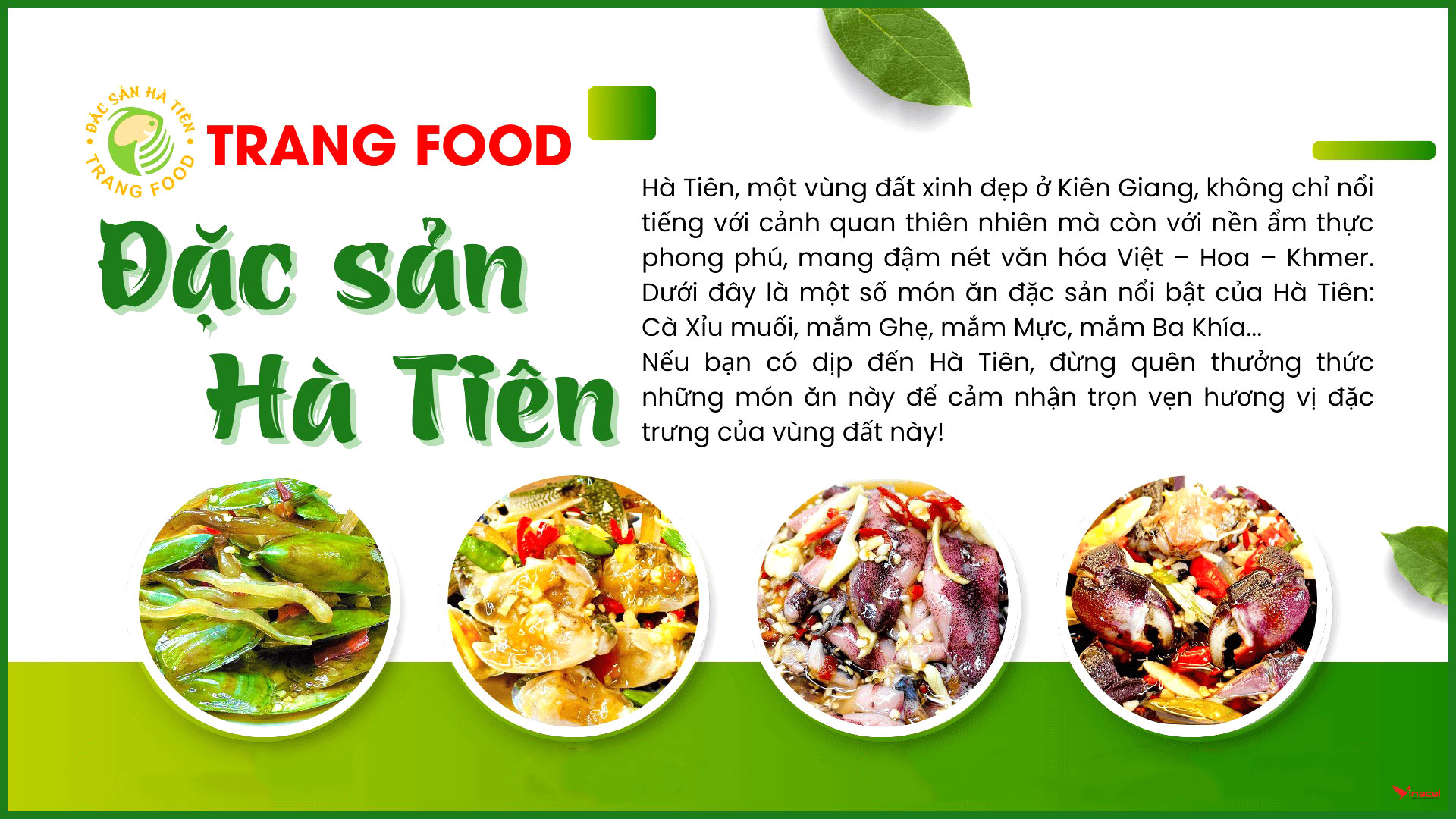 Trang Food là thương hiệu chuyên cung cấp sỉ và lẻ các loại đặc sản truyền thống Hà Tiên, nổi bật với các dòng sản phẩm mắm và hải sản chế biến như: Cà Xỉu muối, mắm ghẹ xanh, mắm mực sữa, mắm tôm chua, mắm ruốc xào, mắm Ba Khía và các loại khô cá – khô mực – tôm khô...