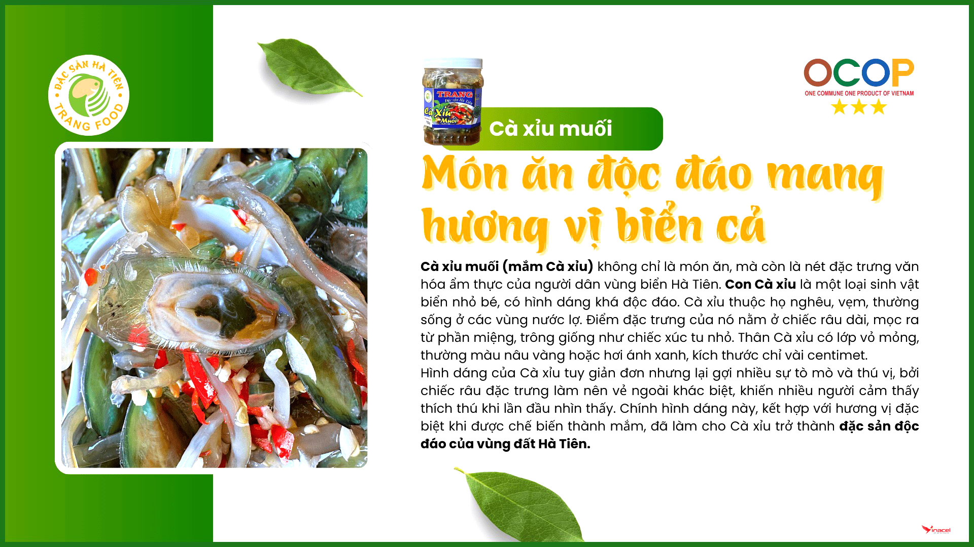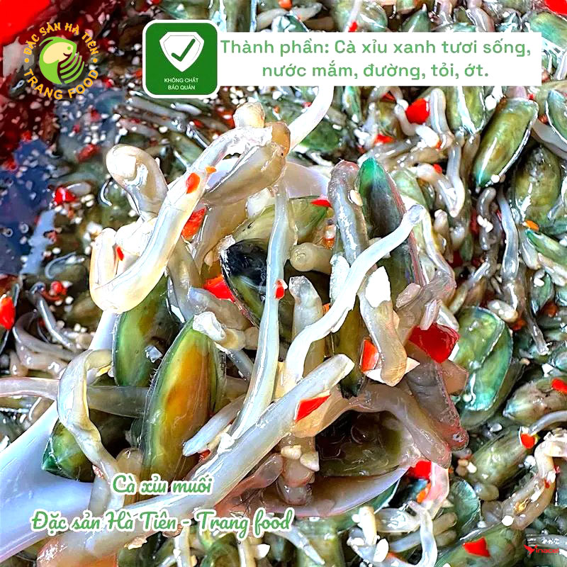 • Cà Xỉu là loài hải sản đặc hữu của vùng biển Hà Tiên. Qua bàn tay khéo léo và bí quyết gia truyền hơn 10 năm của Trang Food, Cà Xỉu muối trở thành đặc sản đậm vị, chinh phục thực khách bởi sự hòa quyện của thịt giòn dai, nước sốt cay nhẹ và mùi thơm độc đáo của tỏi ớt – xứng danh “thương hiệu sản phẩm OCOP của vùng đất cực Tây Nam Tổ quốc”.