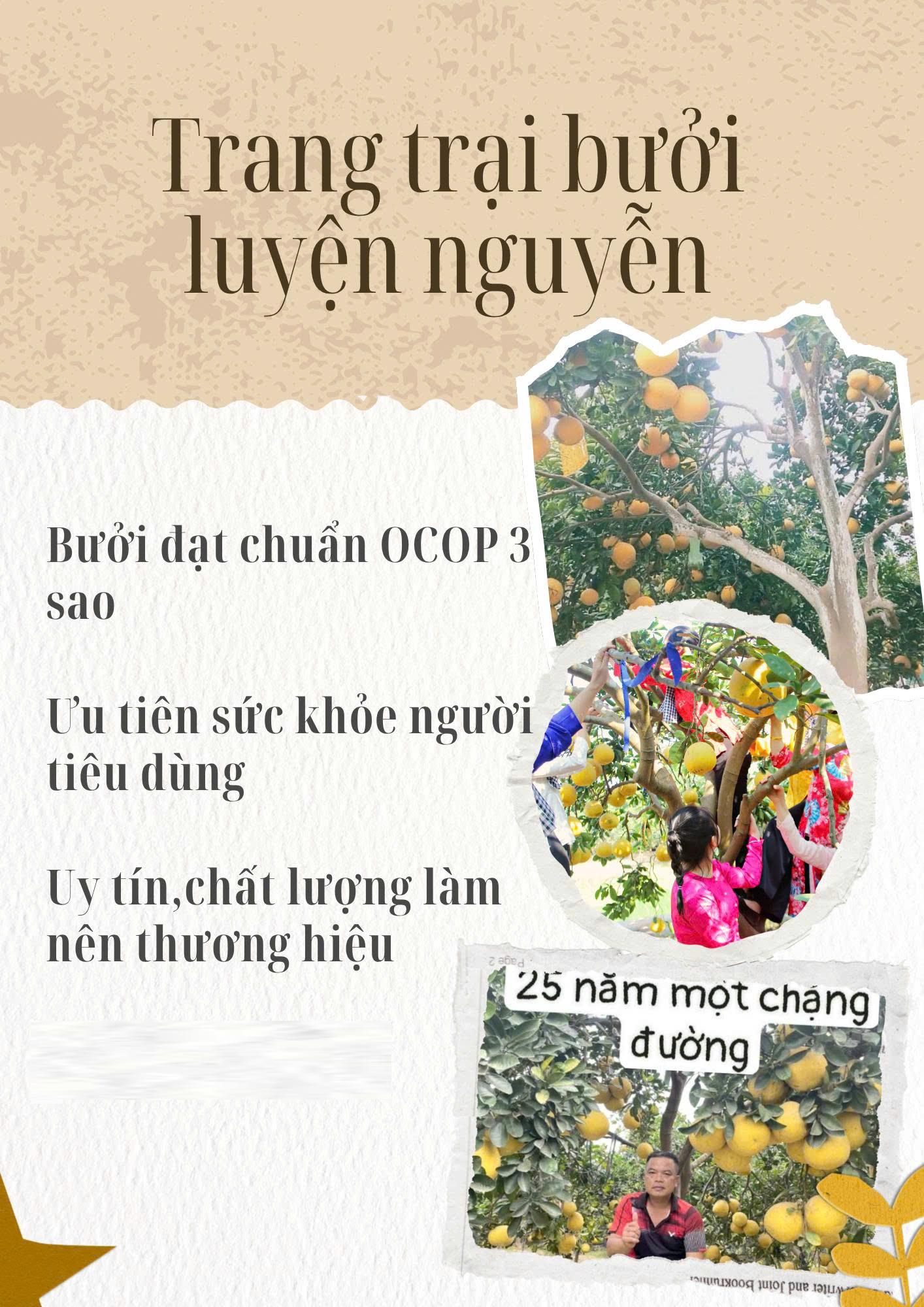 Được sự giới thiệu của UBND xã Lam Điền và hướng dẫn của Phòng Kinh tế huyện, gia đình anh đã đăng ký tham gia đánh giá, phân hạng sản phẩm OCOP với 2 sản phẩm bưởi Phúc Trạch và bưởi Diễn. Khi đăng ký tham gia chương trình OCOP, anh Luyện đã được tham gia các buổi tập huấn nâng cao nhận thức về chương trình OCOP, được hỗ trợ thiết kế tem, nhãn, logo sản phẩm, bảo hộ nhãn hiệu cho sản phẩm và được tư vấn hỗ trợ lập hồ sơ đánh giá phân hạng cho sản phẩm bưởi Diễn và bưởi Phúc Trạch của gia đình. Kết quả, năm 2022, 2 sản phẩm bưởi của hộ gia đình anh Nguyễn Tiến Luyện được UBND thành phố Hà Nội cấp giấy chứng nhận sản phẩm OCOP 3 sao.