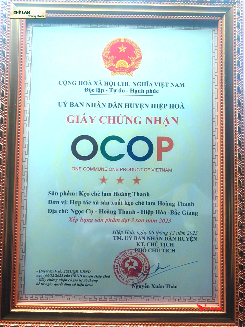 Thực hiện chương trình mỗi xã một sản phẩm, năm 2023, sản phẩm kẹo chè lam thôn Ngọc Cụ xã Hoàng Thanh, huyện Hiệp Hòa, tỉnh Bắc Giang chính thức được công nhận là sản phẩm OCCOP 3 sao. Đây là bước tiến mới, khẳng định thương hiệu của kẹo chè lam Hoàng Thanh. Bên cạnh hàng trăm nghìn thứ kẹo bánh hiện đại ngon mắt, bạn bè, người tiêu dùng có thể lựa chọn kẹo chè lam Hoàng Thanh- món quà quê dân dã, dung dị, ngọt ngào và gần gũi để thưởng thức cùng gia đình, người thân.