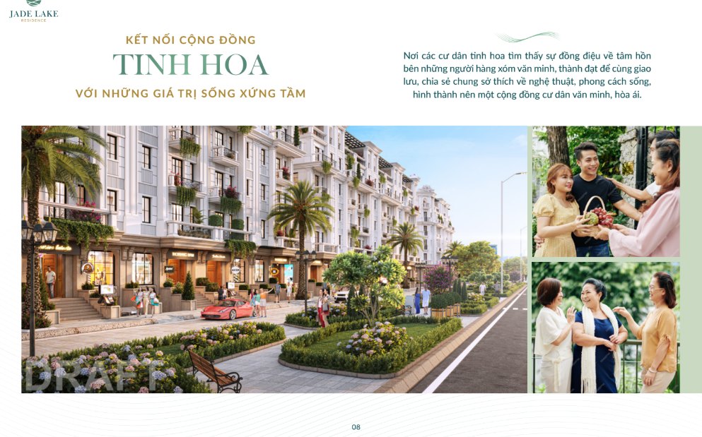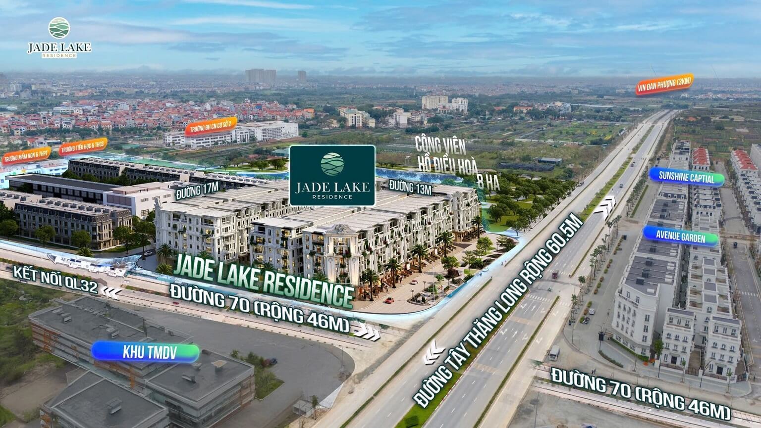 Dự án Jade Lake Residence là khu nhà ở cao cấp gồm 82 căn liền kề và 8 căn biệt thự nằm trên trục đại lộ Tây Thăng Long, đối diện Avenue Garden, kế bên công viên và hồ nước ngọt rộng 8ha. Toàn bộ dự án được thiết kế theo phong cách châu Âu sang trọng hoà quyện với vẻ đẹp thuần khiết của thiên nhiên tạo nên "dấu ấn thịnh vượng" bên đại lộ Tây Thăng Long.