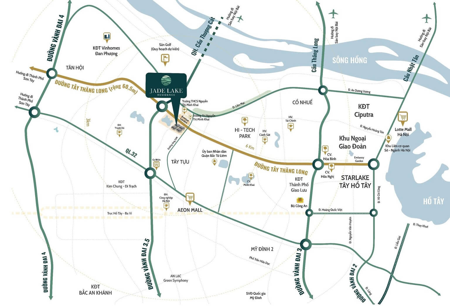Dự án Jade Lake Residence sở hữu vị trí đắc địa cùng hạ tầng phát triển tại cửa ngõ phía Tây Thủ Đô, nơi dòng chảy huyết mạnh giao thông Tây Thăng Long, với đại lộ Tây Thăng Long có thiết kế 60,5m với 10 làn xe hoạt động kết nối các tuyến đường nội đô quan trọng của Thành phố như: Đường vành đai 3.5, Phạm Văn Đồng, Văn Tiến Dũng, Tuyến đường sắt nội đô Metro 3,4… mang đến cơ hội đầu tư tiềm năng sinh lời cao.