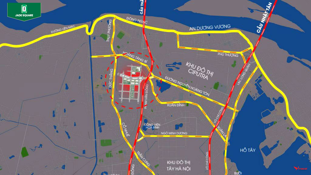 Từ đây, cư dân Jade Square chỉ mất 5 phút để di chuyển tới cầu Thăng Long, 10 phút tới cầu Nhật Tân, 25 phút để tới sân bay Nội Bài, 20 phút vào trung tâm thành phố Hà Nội. Song hành với chủ trương của thành phố Hà Nội đưa toàn bộ trụ sở làm việc của các cơ quan hành chính, các Đại sứ quán về khu vực phía Tây Hà Nội, mạng lưới giao thông được nâng cấp đồng bộ, trong đó phải kể đến việc mở rộng đường Phạm Văn Đồng từ 56m lên 93m và kết nối đường vành đai 3 nối dài đường Nguyễn Văn Huyên song song với tuyến đường sắt đô thị số 2.
