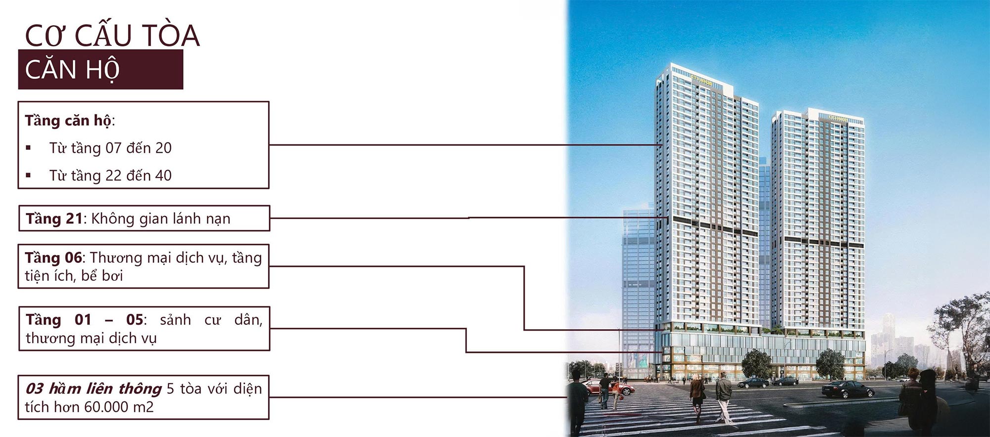 Khối Căn Hộ Cao Cấp (Tầng 7-20 và 22-40): Các căn hộ được bố trí từ tầng 7 trở lên, tối đa hóa tầm nhìn thoáng ra Đại lộ Thăng Long, hồ điều hòa và đại đô thị đã hiện hữu.