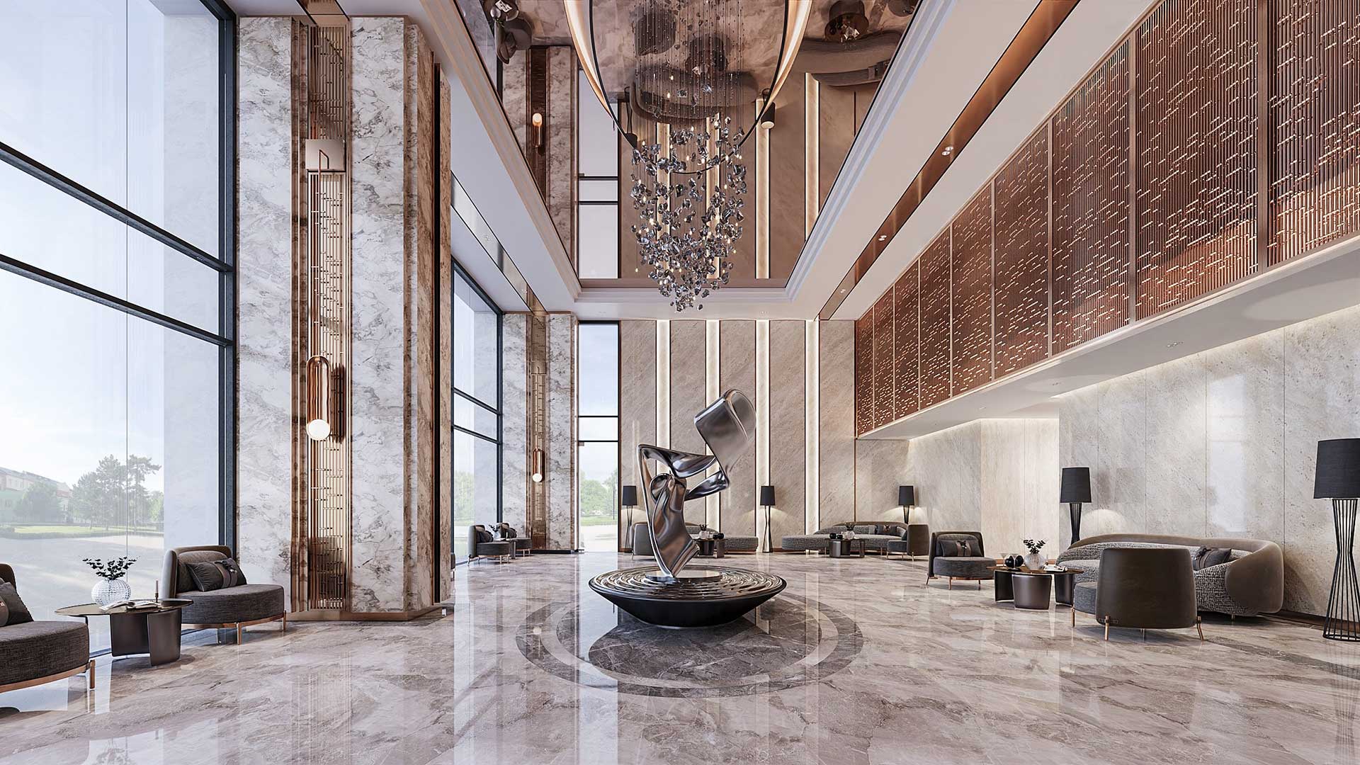Sảnh đón tiêu chuẩn khách sạn được thiết kế sang trọng, hiện đại với hệ thống đèn chùm cao cấp, sàn đá marble bóng loáng. Khu vực lễ tân rộng rãi, thoáng đãng, tạo ấn tượng mạnh mẽ ngay từ lần đầu tiên cư dân và khách đến thăm.