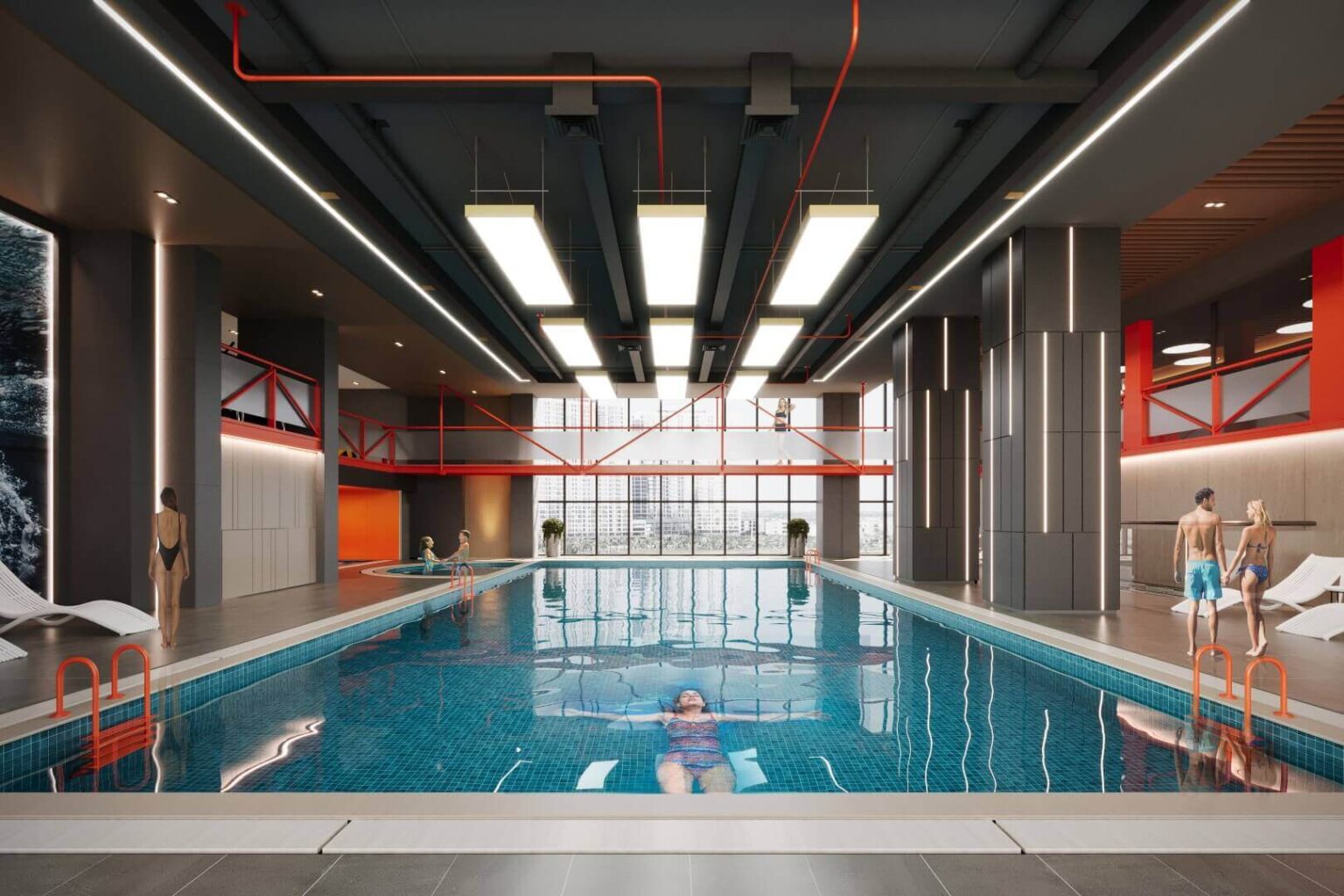 Khu vực xung quanh bể bơi được bố trí deck tắm nắng với ghế nằm cao cấp, ô che nắng sang trọng. Cư dân có thể thư giãn, đọc sách hoặc tận hưởng không khí trong lành trên cao. Không gian bể bơi được tách biệt hoàn toàn khỏi khối thương mại ồn ào bên dưới, đảm bảo sự riêng tư tuyệt đối.