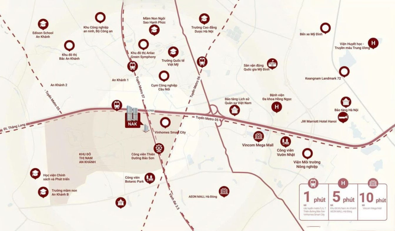 Hoài Đức dự kiến lên Quận, tạo đòn bẩy lớn cho giá trị bất động sản. Metropoli 5 nằm giữa khu vực phát triển thương mại mới, bao quanh bởi cụm 5 tòa Vietradico và 15 tòa Sudico sắp xây dựng, hình thành lõi thương mại sầm uất.