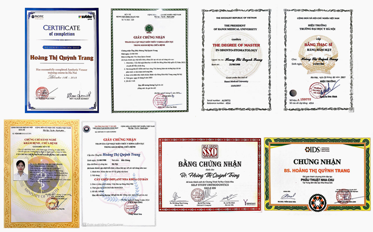 Năm 2016, BS Quỳnh Trang tốt nghiệp Thạc sĩ chuyên ngành Răng Hàm Mặt tại Viện Đào Tạo Răng Hàm Mặt – Đại Học Y Hà Nội. Sau đó chị tiếp tục học các chứng chỉ chuyên sâu như: Thai Association of Orthodontists; Cắn khớp học lâm sàng; Phẫu thuật nha chu, Chỉnh nha Self Study Orthodontics, Chỉnh nha Bioprogressive – MEAW tại DENTWIN, Aesthetic Veneer training course in Ha Noi,… Với hơn 14 năm trong lĩnh vực phục hình răng sứ thẩm mỹ và chỉnh nha, Th.Bs Quỳnh Trang đã kiến tạo hơn 10000 nụ cười cho các khách hàng trong và ngoài nước và là khách mời danh dự của các chương trình VTV.