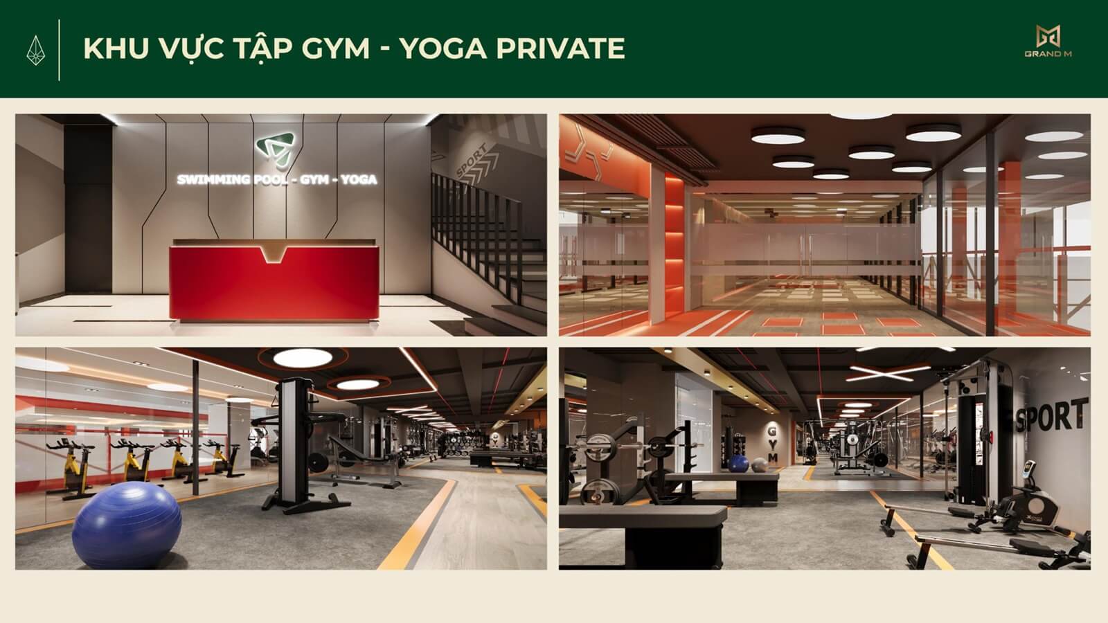 Phòng gym hiện đại: Trang bị đầy đủ máy móc và không gian luyện tập chuyên nghiệp.