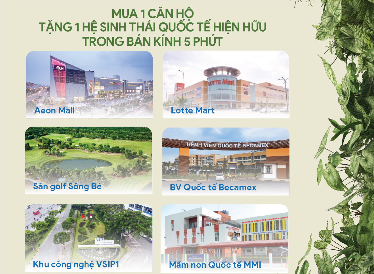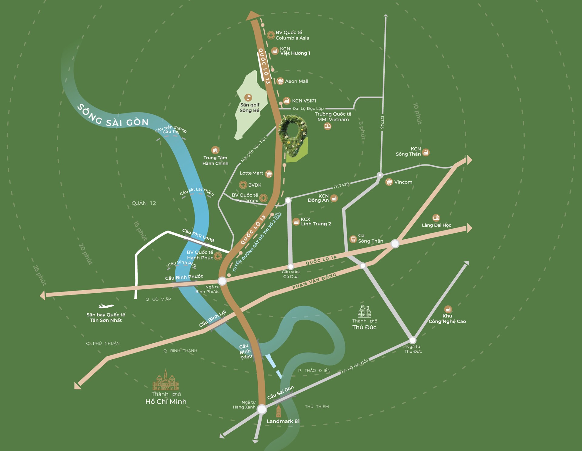 · 1 km – KCN VSIP, Sân Golf Sông Bé.
