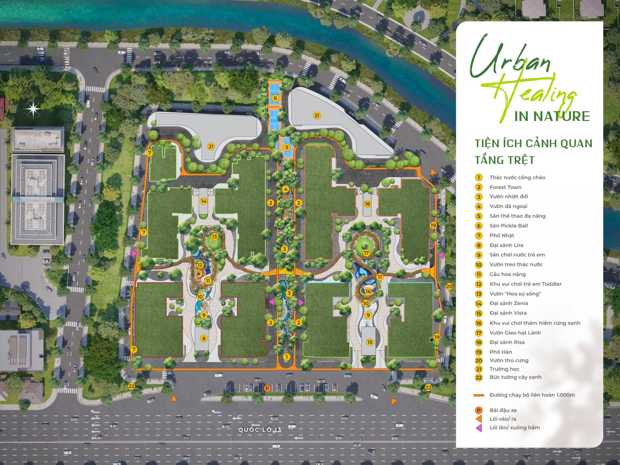· Đường chạy bộ dài gần 1.000m kết nối xuyên suốt các khu chức năng.