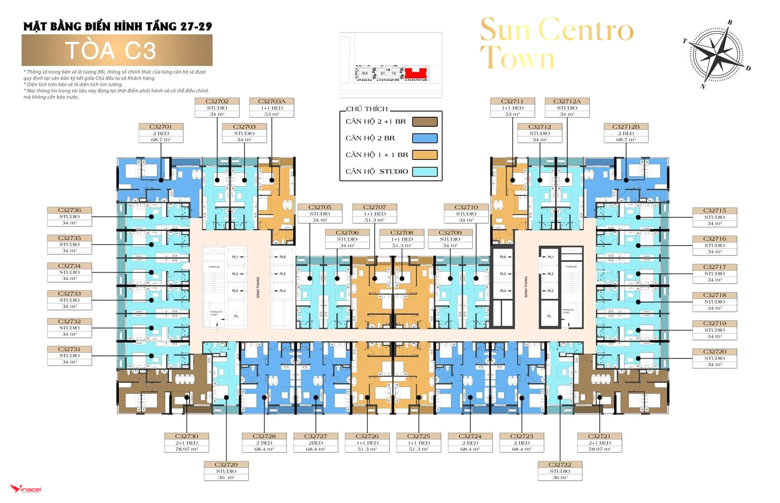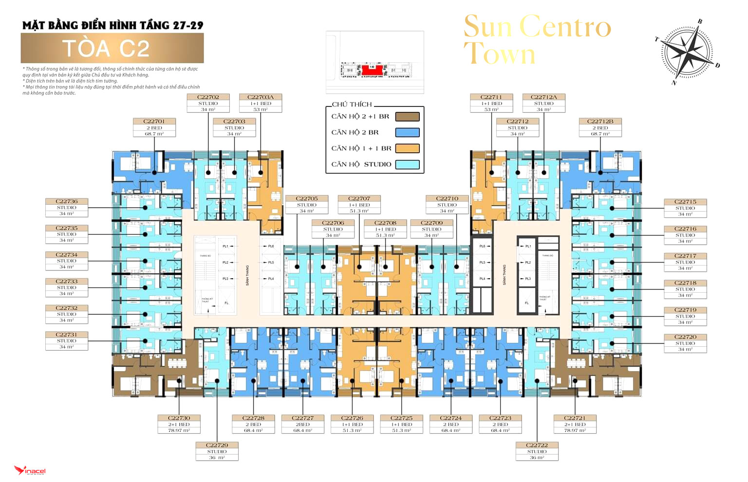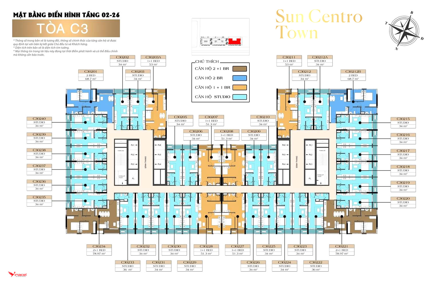 • Tầng 2-29 (chiều cao trần 3,5m): Căn hộ du lịch với đa dạng loại hình từ studio đến căn 3 phòng ngủ, phù hợp với nhiều đối tượng khách hàng.