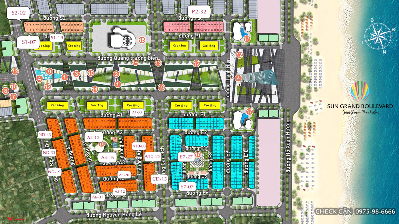 Phân khu Sun Grand Boulevard có bị trí được coi là đắc địa nhất của toàn dự án, khi có phần quảng trường “ngoi” ra sát với biển, chiếm trọn bề ngang 155m của “con đường vàng” Hồ Xuân Hương.
