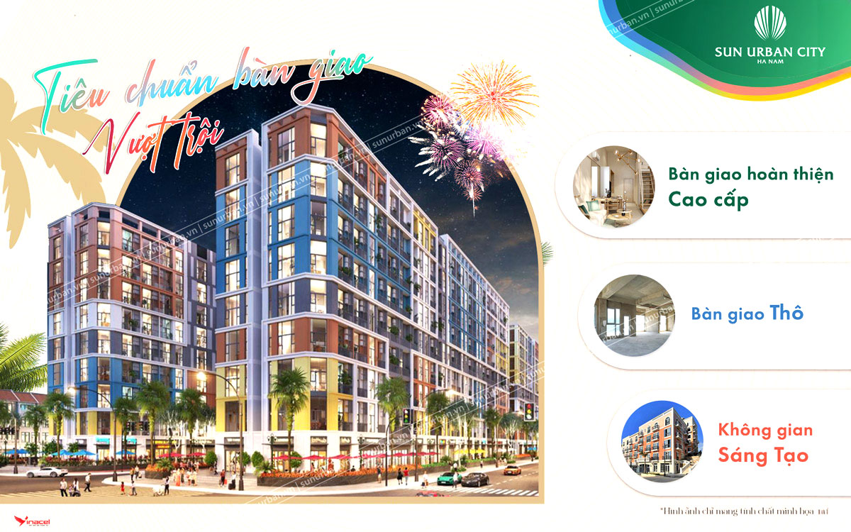 • Sun Urban City Hà Nam không chỉ đáp ứng nhu cầu an cư mà còn mang đến cho cư dân những trải nghiệm sống đẳng cấp, nâng tầm chất lượng cuộc sống. Dự án hứa hẹn sẽ trở thành điểm đến lý tưởng cho những ai đang tìm kiếm một không gian sống sang trọng, tiện nghi và đẳng cấp tại thành phố Phủ Lý xinh đẹp.