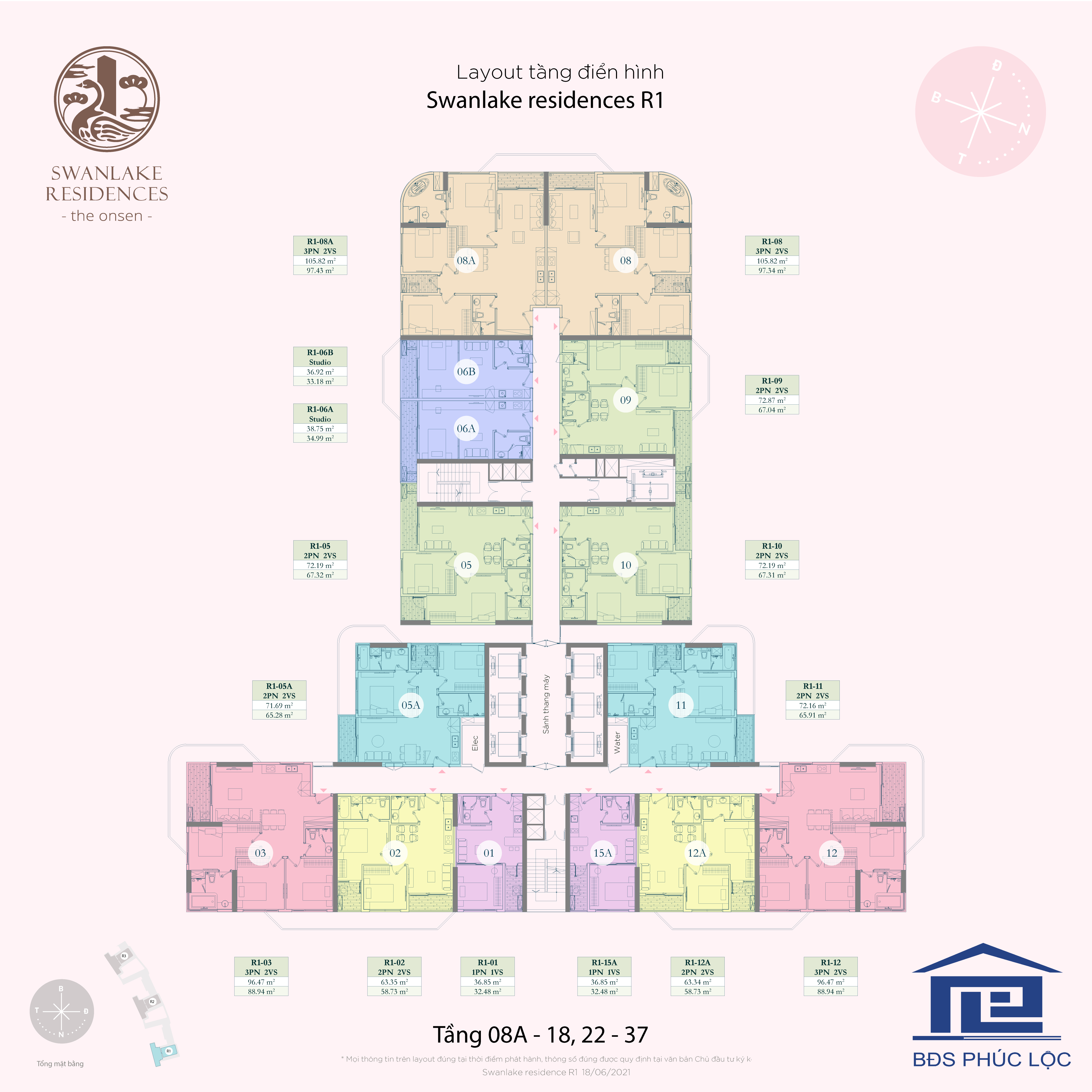 Tầng điển hình 08A-18, 22-37 có tổng cộng 15 căn hộ trên 1 sàn. Có 4 căn hộ 3PN đều là các căn góc, 7 căn hộ 2PN và 2 căn hộ 1PN và 2 căn Studio.