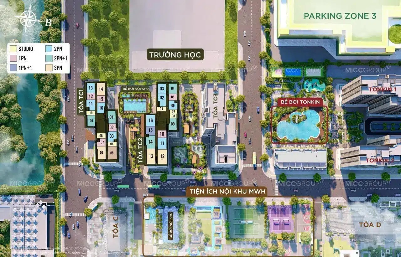 • Hướng Tây Bắc: Tiếp giáp với tiện ích nội khu của phân khu The Tonkin