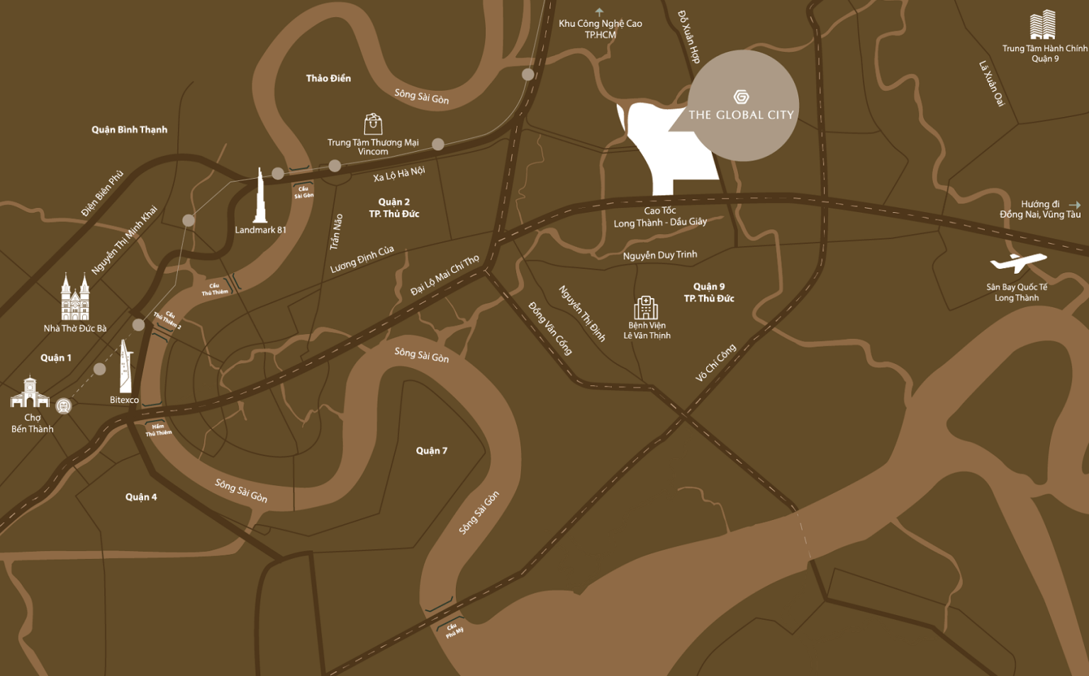 • Dự án The Global City có vị trí đắc địa hai mặt tiền giáp hai trục đường quan trọng bậc nhất khu đông Sài Gòn: Cao tốc TP.HCM – Long Thành – Dầu Giây và đường Đỗ Xuân Hợp. Đặc biệt, dự án có một mặt giáp sông Rạch Chiếc và mặt còn lại giáp khu đô thị thể thao Saigon Sports City 64ha.