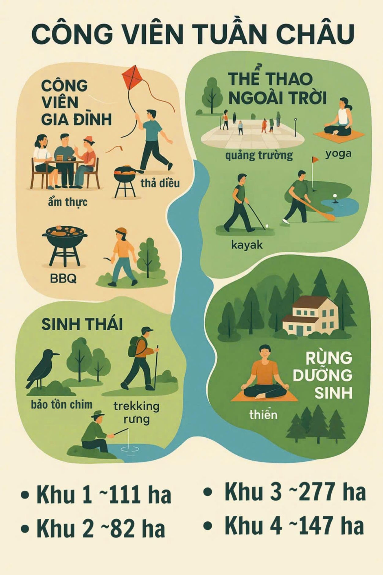 Hệ thống công viên: Hàng loạt công viên lớn nhỏ được bố trí xen kẽ. Nổi bật là công viên ven sông, công viên trung tâm và các vườn tiểu cảnh, mang lại không khí trong lành và là lá phổi xanh cho toàn khu.