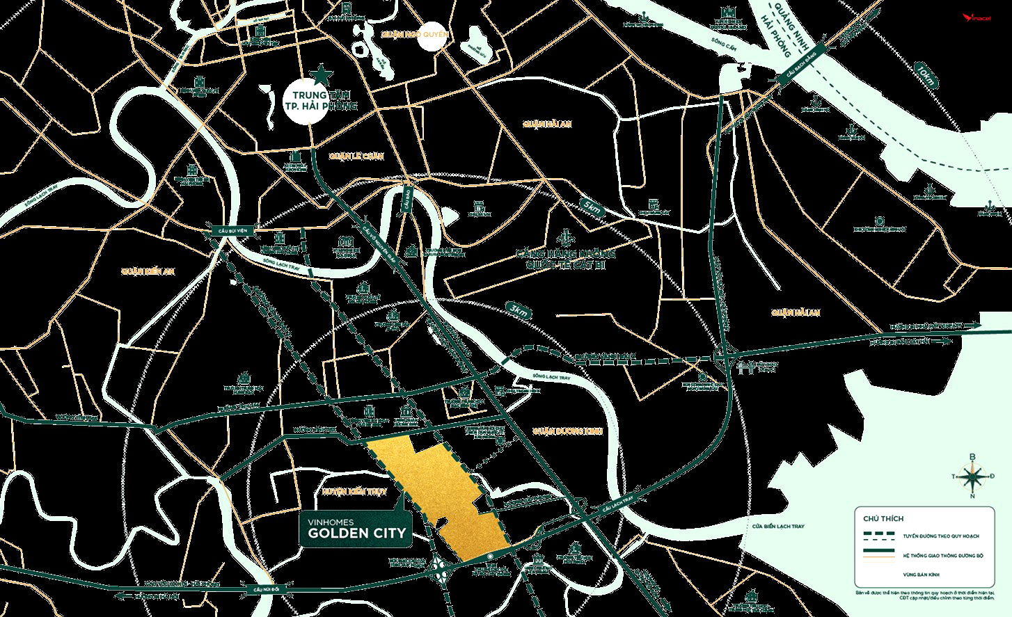 Vinhomes Golden City nằm tại cửa ngõ phía Đông Nam của Thành phố Hải Phòng, kết nối trực tiếp với các tuyến giao thông huyết mạch như cao tốc Hà Nội – Hải Phòng – Quảng Ninh, chỉ mất 90 phút để đến Thủ đô Hà Nội, 40 phút đến thành phố du lịch Quảng Ninh và các tỉnh thành trong cụm Công nghiệp Bắc Bộ như Hải Dương, Bắc Ninh, Thái Nguyên. Chỉ 10 phút để di chuyển vào trung tâm thành phố, 15 phút đến Cảng biển và các Khu công nghiệp trọng điểm của TP. Hải Phòng. Đây là lợi thế vô cùng lớn để Dự án tạo dựng tọa độ “đa điểm chạm”, kết nối thuận lợi với các tiềm năng phát triển kinh tế, công nghiệp, du lịch…