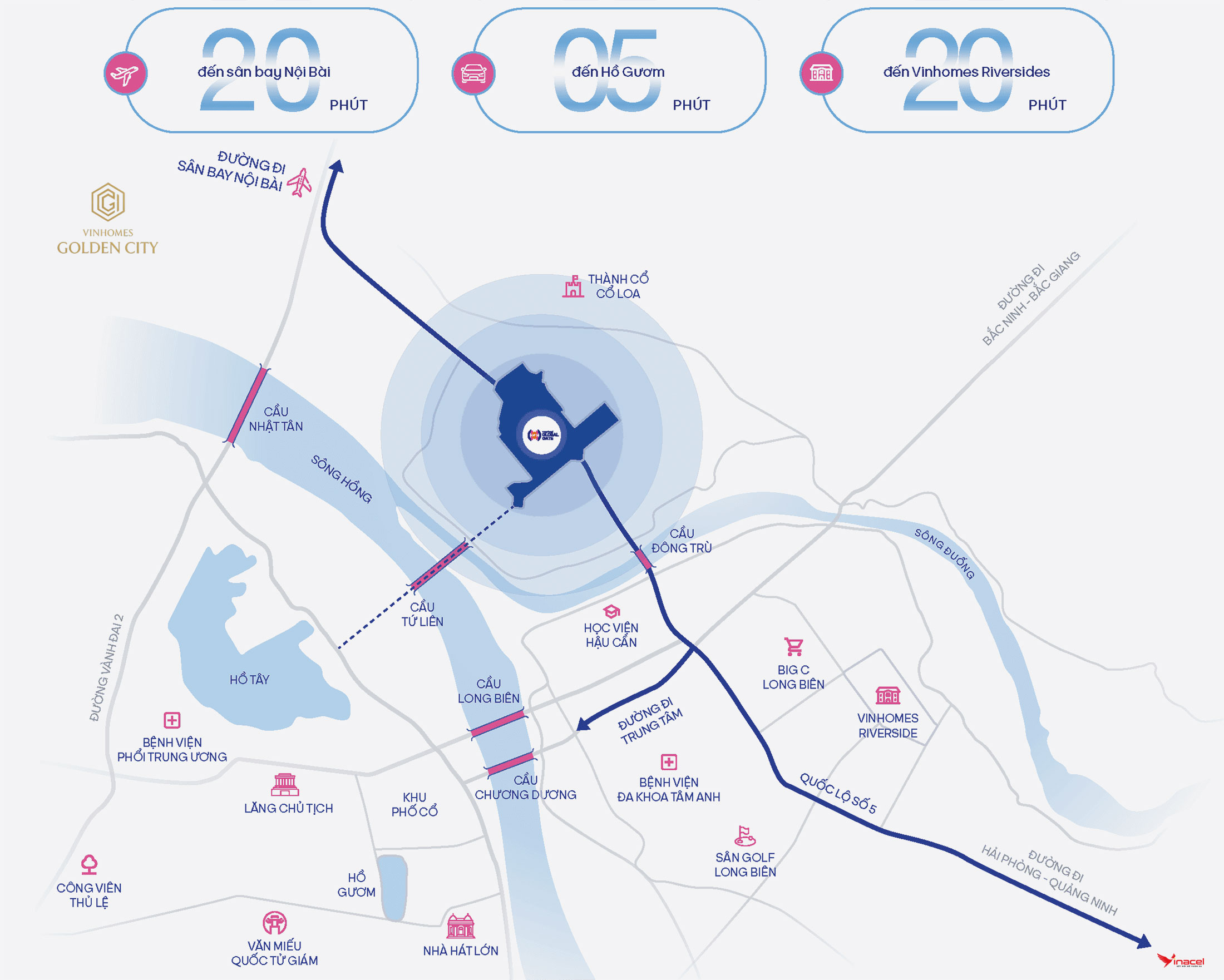 Nằm trên trục đường Trường Sa (Quốc lộ 5), Vinhomes Golden City là tâm điểm phía Đông Bắc, liền kề lõi trung tâm Thủ đô. Vị trí này cho phép cư dân dễ dàng kết nối nhanh chóng tới sân bay Quốc tế Nội Bài, trung tâm Hà Nội và các tỉnh thuộc vùng kinh tế trọng điểm phía Bắc như Hải Phòng, Quảng Ninh, Bắc Ninh, Bắc Giang, Thái Nguyên.