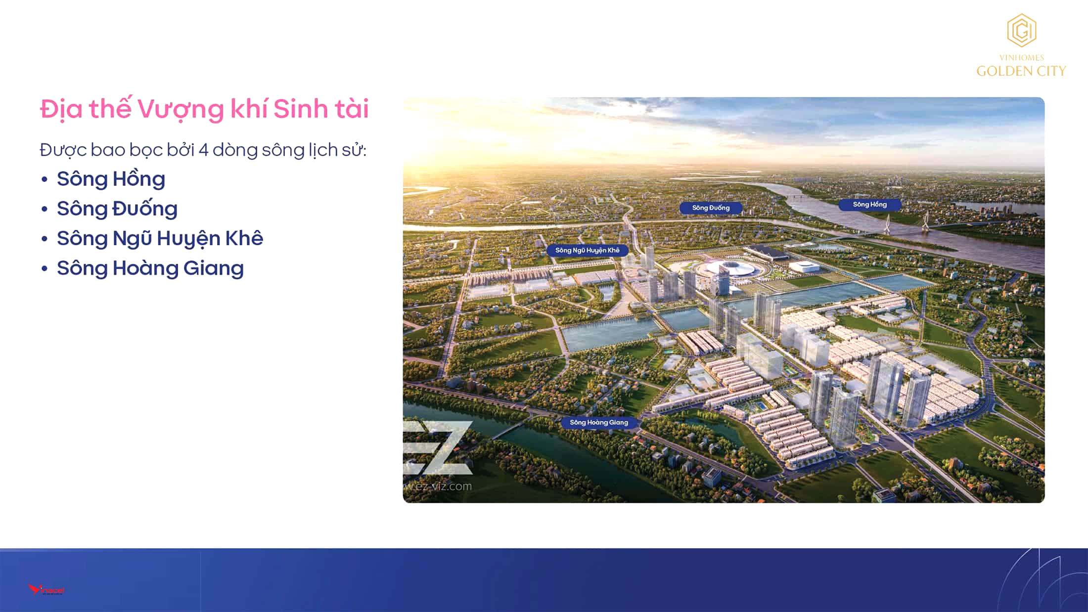 Vinhomes Golden City tọa lạc tại vị trí đắc địa, liền kề Thành Đan Phượng – kinh đô đầu tiên của nước Âu Lạc, một vùng đất được coi là vượng khí từ xa xưa. Dự án được bao bọc bởi 4 dòng sông trù phú: sông Hồng, sông Ngũ Huyện Khuê, sông Hoàng Giang và sông Đuống, mang đến không khí trong lành và sinh khí tài lộc thịnh vượng cho cư dân.