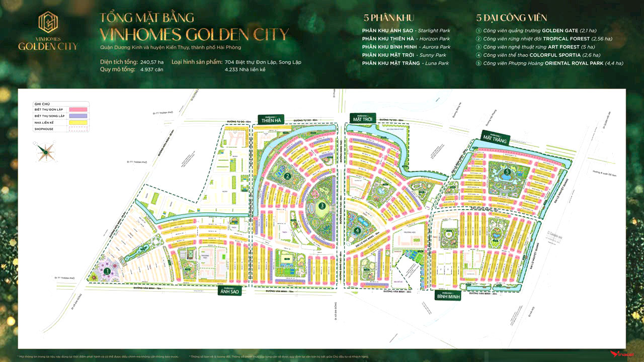 • Diện tích Dự Án Vinhomes Golden City – Vinhomes Dương Kinh Hải Phòng : 240ha (gồm 69,4ha xây dựng nhà ở( 13.9ha xây cao tầng + 36,6ha xây thấp tầng) và 28,9ha xây dựng các công trình thương mại, dịch vụ công cộng.