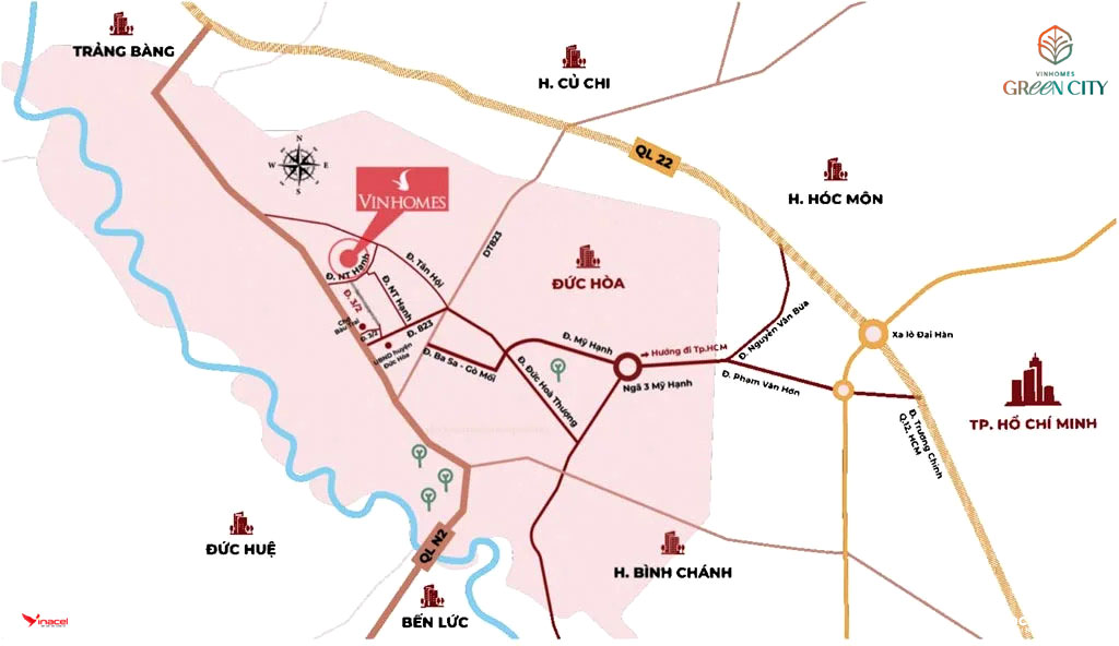 • Về di chuyển: Từ khu đô thị, cư dân dễ dàng đi đến các khu vực lân cận như Đức Huệ, Bến Lức, TP. Tân An, TP. HCM, tỉnh Tây Ninh,… thông qua các tuyến đường hiện hữu như ĐT822, ĐT823, ĐT825, Quốc lộ N2,…