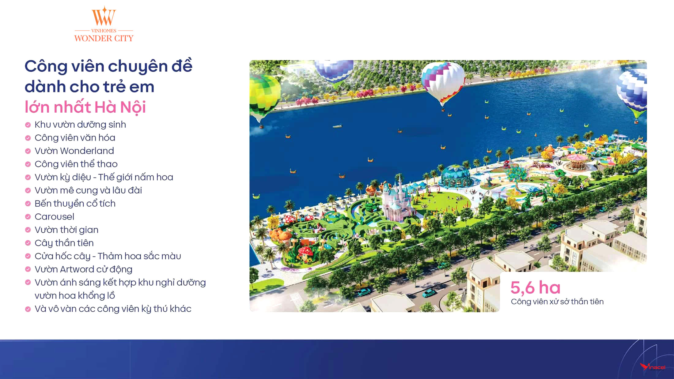 Công viên Wonderland rộng 5,6ha là điểm nhấn xanh đặc biệt của dự án. Lấy cảm hứng từ những câu chuyện cổ tích, công viên Xứ Sở Thần Tiên là nơi lý tưởng để trẻ em thỏa sức vui chơi, khám phá và phát triển mọi giác quan. Đây không chỉ là không gian giải trí cho trẻ em mà còn là nơi thư giãn, tận hưởng không khí trong lành cho mọi thành viên trong gia đình.