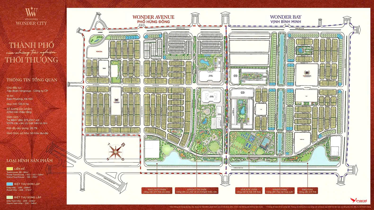 Vinhomes Wonder City, một siêu dự án đô thị với quy mô lên đến 385 hecta, hứa hẹn trở thành một thành phố thu nhỏ đẳng cấp quốc tế tại phía Bắc Hà Nội. Được quy hoạch bài bản và thiết kế tỉ mỉ, dự án chia thành 3 phân khu chính là: Phân khu Tinh Hoa, Phân khu Thịnh Vượng và Phân khu Cát Tường.