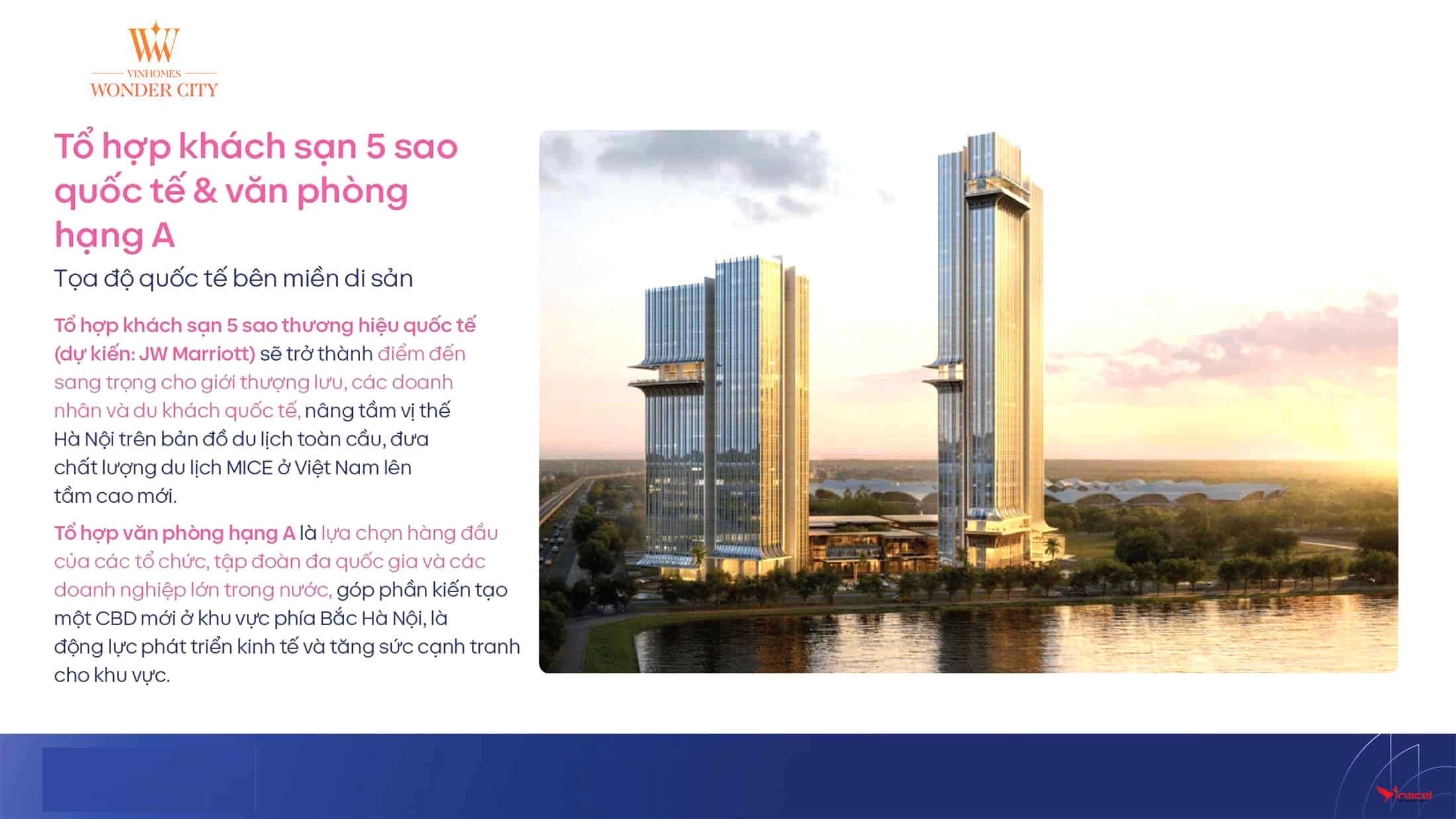 Dự án sở hữu tổ hợp khách sạn 5 sao với thiết kế đặc biệt, dự kiến được quản lý và vận hành bởi thương hiệu hàng đầu thế giới Marriott. Bên cạnh đó, tổ hợp văn phòng hạng A sẽ là nơi làm việc lý tưởng cho các doanh nghiệp trong nước và quốc tế, góp phần biến Vinhomes Wonder City trở thành trung tâm thương mại, hội nghị, hội thảo hàng đầu.
