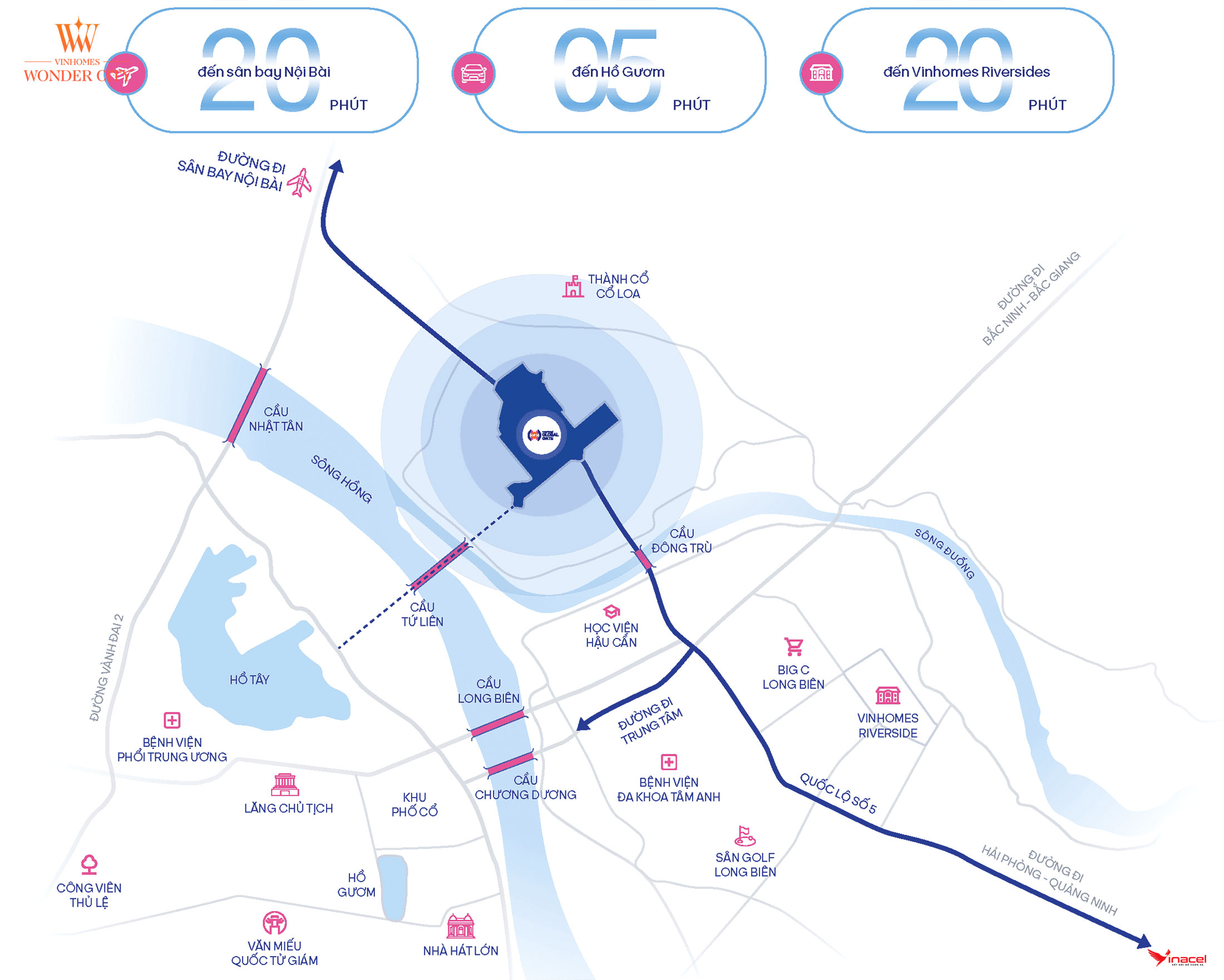 Nằm trên trục đường Trường Sa (Quốc lộ 5), Vinhomes Wonder City là tâm điểm phía Đông Bắc, liền kề lõi trung tâm Thủ đô. Vị trí này cho phép cư dân dễ dàng kết nối nhanh chóng tới sân bay Quốc tế Nội Bài, trung tâm Hà Nội và các tỉnh thuộc vùng kinh tế trọng điểm phía Bắc như Hải Phòng, Quảng Ninh, Bắc Ninh, Bắc Giang, Thái Nguyên.