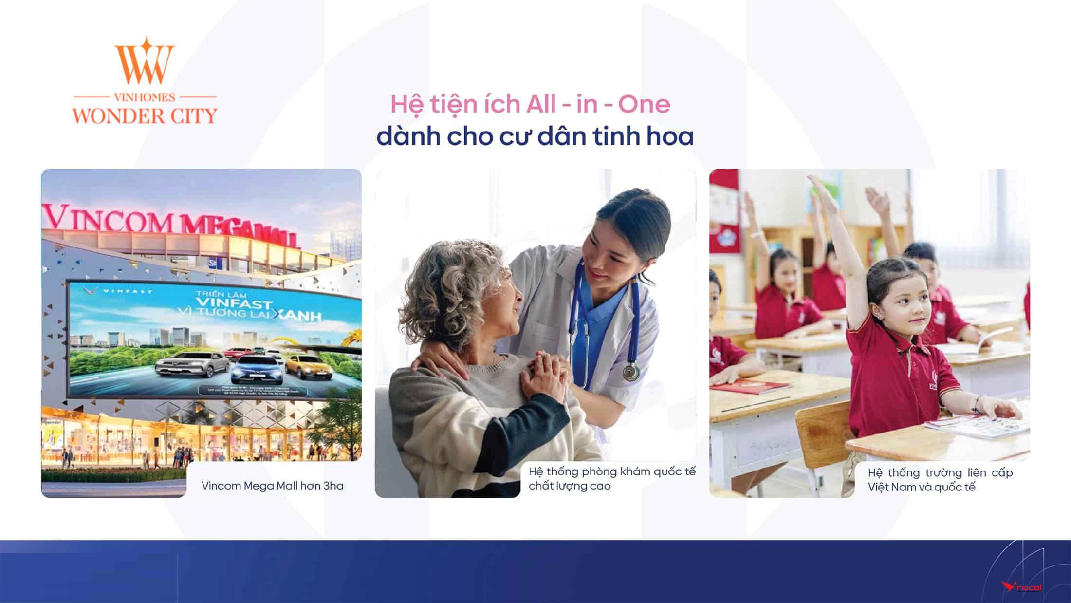 Sống tại Vinhomes Wonder City, cư dân sẽ được tận hưởng cuộc sống tiện nghi, hiện đại với đầy đủ tiện ích ngay trong tầm tay, từ mua sắm, giải trí đến giáo dục và chăm sóc sức khỏe. Đây thực sự là một “thành phố thu nhỏ” hoàn hảo, nơi mọi nhu cầu của cuộc sống đều được đáp ứng một cách trọn vẹn và đẳng cấp.
