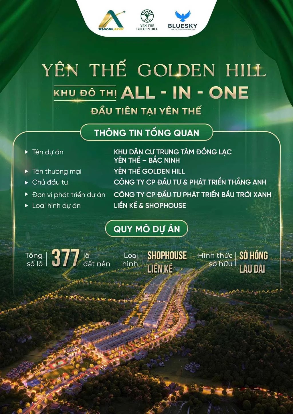 Yên Thế Golden Hill là một dự án đất nền liền kề shophouse nổi bật tại huyện Yên Thế, tỉnh Bắc Giang. Được đầu tư xây dựng bởi Công ty cổ phần đầu tư Thắng Anh và phát triển dự án bởi Blue Sky Invest, dự án mang tầm nhìn kiến tạo một khu đô thị hiện đại, tiện nghi và giàu tiềm năng đầu tư. Với tổng diện tích 12,8 ha, Yên Thế Golden Hill Bắc Giang cung cấp 377 lô đất nền, được quy hoạch đồng bộ với các tiện ích cao cấp như trung tâm thương mại, công viên thể thao và không gian xanh rộng lớn.