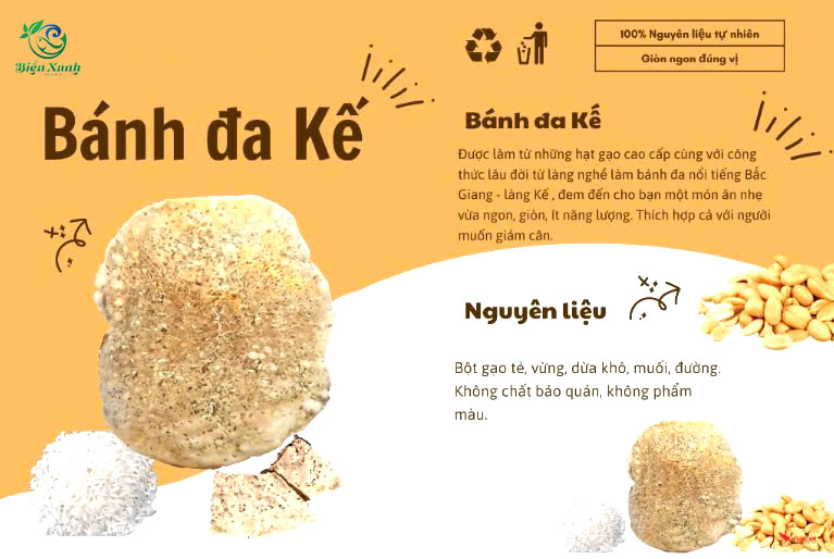 • Được làm từ những hạt gạo tuyển chọn cùng với công thức của làng nghề làm bánh đa lâu đời, nổi tiếng đã tạo ra hương vị giòn ngon đặc trưng mang tên đặc sản Bắc Giang – bánh đa Kế.